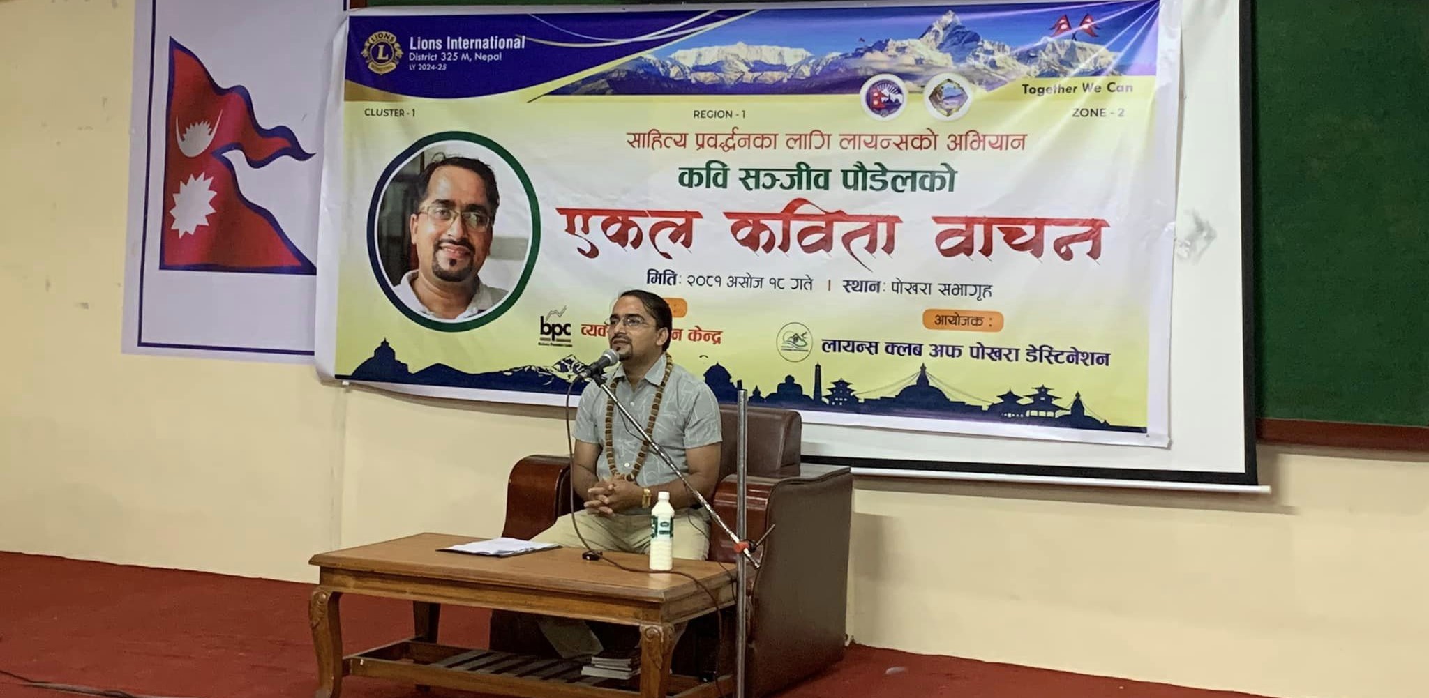 पोखरा । लायन्स क्लब अफ पोखरा डेस्टिनेसनको आयोजना, व्यवसाय प्रवर्द्धन केन्द्रको समन्वयमा पोखरा सभागृह मिनीहलमा साहित्यकार सञ्जीव पौडेलको एकल कविता वाचन सम्पन्न भएको छ |