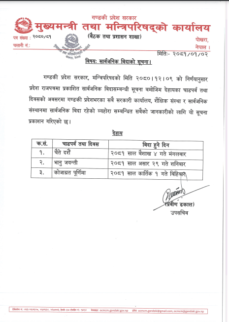 आज कात्तिक १ गते गण्डकी प्रदेशमा सार्वजनिक बिदा- सूचनासहित