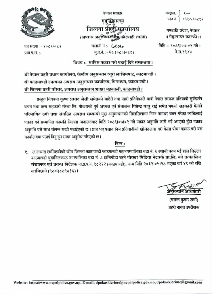 राष्ट्रिय स्वतन्त्र पार्टीका सभापति रवि लामिछानेलाई पक्राउ गर्न कास्की प्रहरीले नेपाल प्रहरीको केन्द्रीय अनुसन्धान ब्युरो (सिआइबी) लाई पत्राचार गरेको छ ।