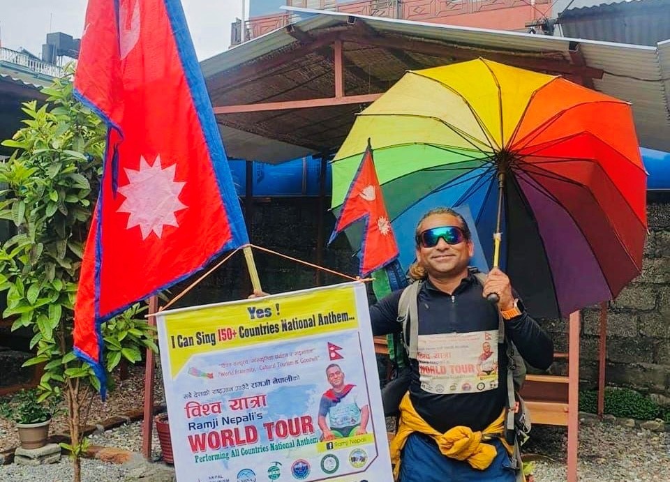 विश्वबन्धुत्व, सांस्कृतिक पर्यटन र सद्भावनाको सन्देशसहित विश्व राष्ट्रगान यात्री रामजी नेपाली भारत यात्रामा निस्किएका छन् । सोमबार पोखरादेखि बुटवल हुँदै उनी भारतको देहरादुनतर्फ लागेका हुन् । नेपालीले एक सय ६० देशका राष्ट्रगान गाउँदै आएका छन् । चन्द्र–सूर्य अङ्कित झन्डासहित देहरादुन, दिल्लीलगायत भारतका विभिन्न सहरको यात्रा गर्ने उनले बताए ।