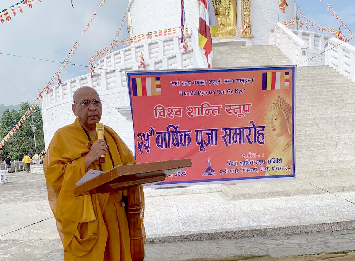 पुम्दीभुम्दीको अनदु डाँडामा रहेको विश्व शान्ति स्तूपमा सोमबार २५ औं वार्षिक पूजा भएको छ । त्यस अवसरमा भिक्षु संघरत्न मानकेले पोखराको रमणीय वातावरण, विश्व प्रसिद्ध सगरमाथाको देशमा यो पूजामा यो पूजामा सहभागी हुन पाउनु पुण्य र कर्मको फल रहेको बताए । जापान, चाइना, नेपाल र भारतका भिक्षुहरु एकसाथ मिलेर यो पूजा गर्दा करुणा मैत्री विश्व बन्धुत्वको भाव आइरहेको र यो सब बुद्धको शिक्षा, धर्मले गर्दा सबै एक सूत्रमा बाँधिएको उनले सुनाए ।