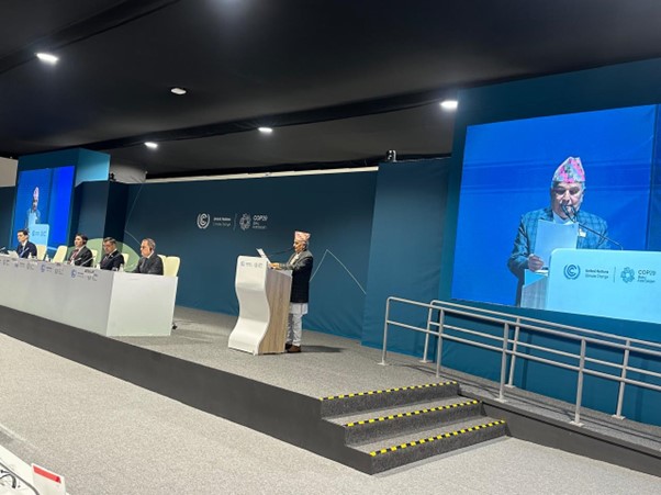 कोप शिखर सम्मेलनमा मङ्गलबार नेपालका तर्फबाट राष्ट्रिय मन्तव्य व्यक्त गर्दै राष्ट्रपति पौडेलले हिमालको सुरक्षा भनेकै पृथ्वीको सुरक्षा हो भन्ने वास्तविकता मनन गर्न विश्व समुदायलाई आह्वान गर्नुभएको थियो । रासस