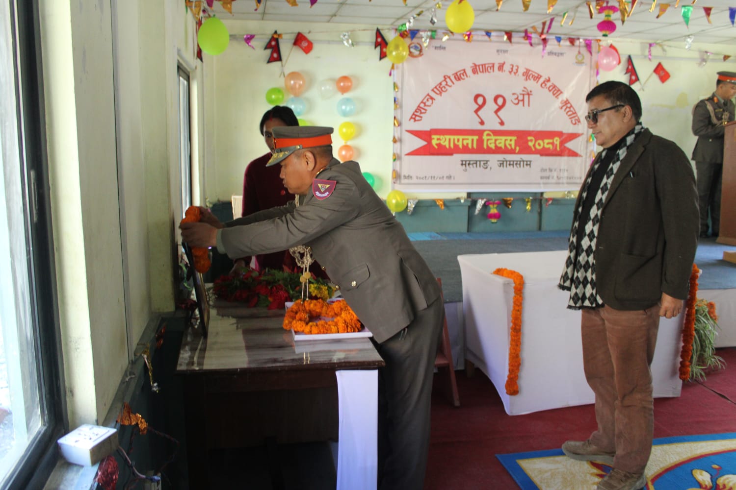 मुस्ताङमा सशस्त्र प्रहरीले एघारौं औं स्थापना दिवस विविध कार्यक्रम गरी मनाएको छ । सशस्त्र प्रहरी बल नेपाल नं. ३३ गुल्म हेडक्वाटर मुस्ताङको आयोजनामा बुधबार मुस्ताङको जोमसोम स्थित होम्दामा सशस्त्र प्रहरी बल नेपाल नं. ३३ हेडक्वाटरले आफ्नो एघारौ स्थापना दिवस मनाएको हो ।