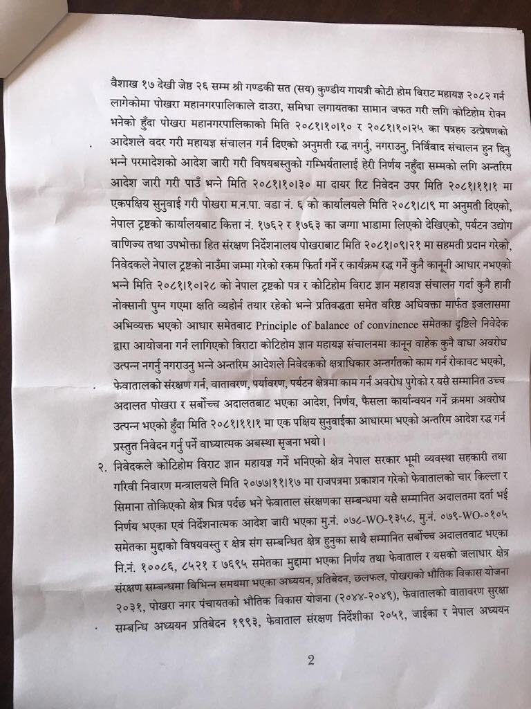 पोखराको लेकसाईडमा गर्न थालिएको कोटिहोम महायज्ञ पोखरा महानगर पालिकाले रोक्न खोजेको भन्दै महायज्ञ आयोजक नेपाल सेवा फाउण्डेशन नेपालले दिएको रिटमा उच्च अदालत पोखराले अन्तरिम आदेश दिँदै महायज्ञ नराेक्न भनेको थियो । फागुन १ गते सो आदेश आएको हो ।