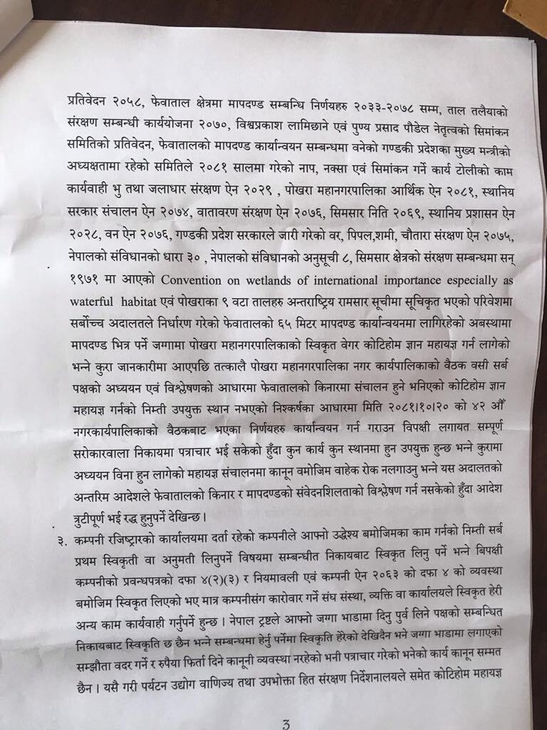निवेदनमा महायज्ञ गर्ने भनिएको स्थल फेवातालको ६५ मिटरको मापदण्डमा समेत पर्ने र केही दिन भित्रै तालको सिमांकन गर्न सुरु गरिने भएकाले पनि तालको मापदण्डभित्र पर्ने जमिनमा महायज्ञ हुन नसक्ने जिकिर गरिएको छ । हेर्नुस् पोखरा महागरले उच्च अदालत पोखरामा दर्ता गराएको निवेदन: