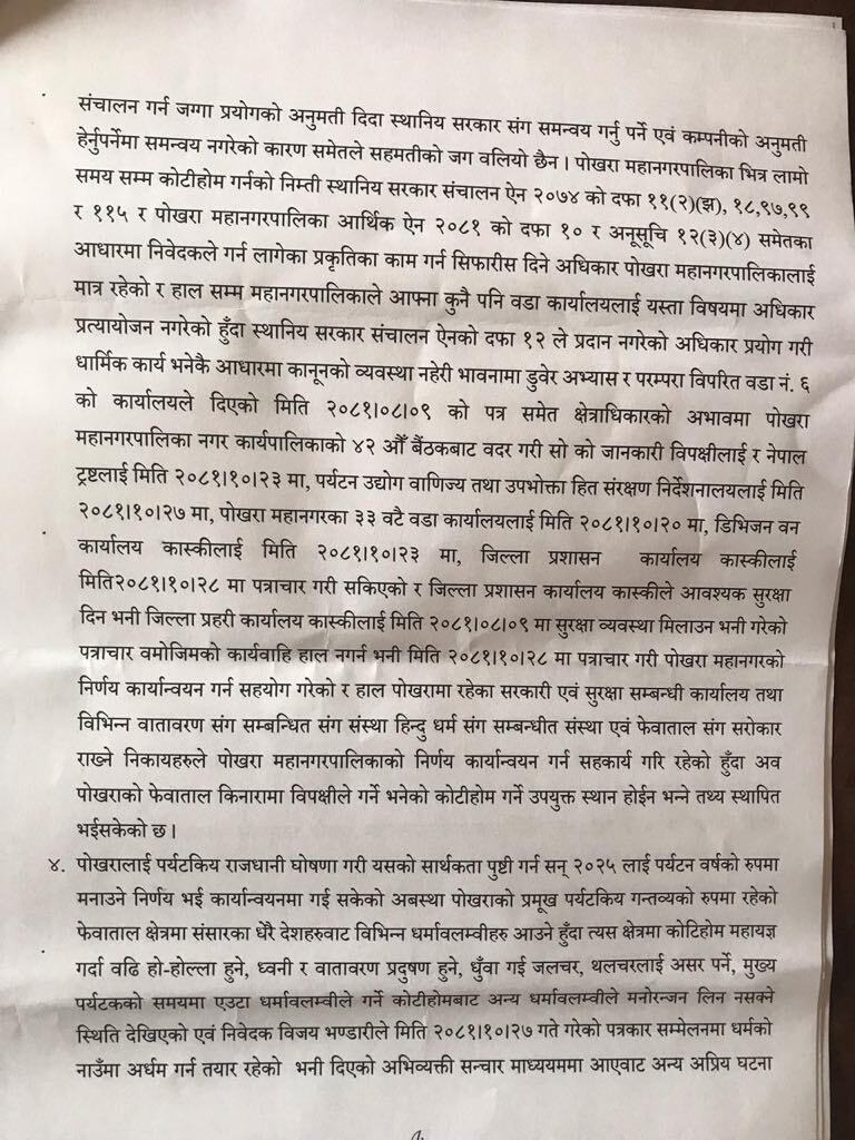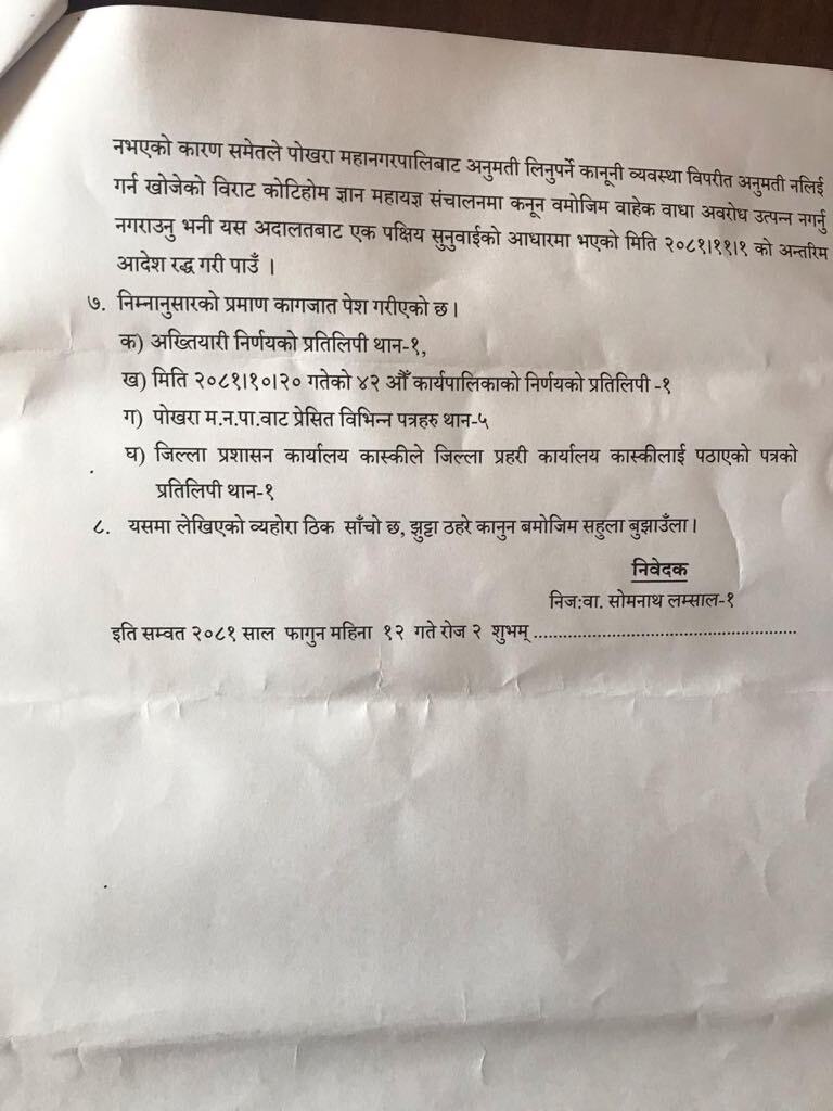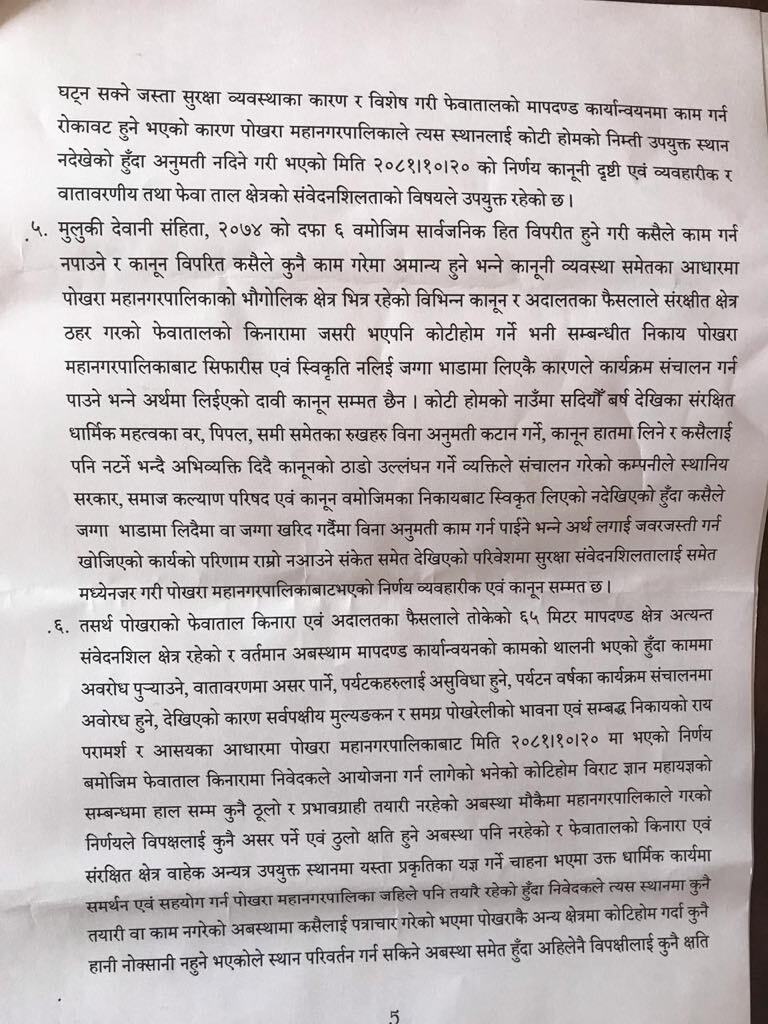 त्यो आदेश वेरितको भन्दै पोखरा महानगर पालिकाले आज सोमबार सो आदेश रद्द गर्न निवेदन दिएको छ । ६ पेज लामो निवेदनमा लेकसाइडमा के कारणले महायज्ञ आयोजना गर्न उपयुक्त छैन भन्ने कुरा उल्लेख गर्दै स्थानीय सरकारले सो स्थानमा महायज्ञ गर्न स्विकृति नदिनुका कारण उल्लेख गरिएको छ ।
