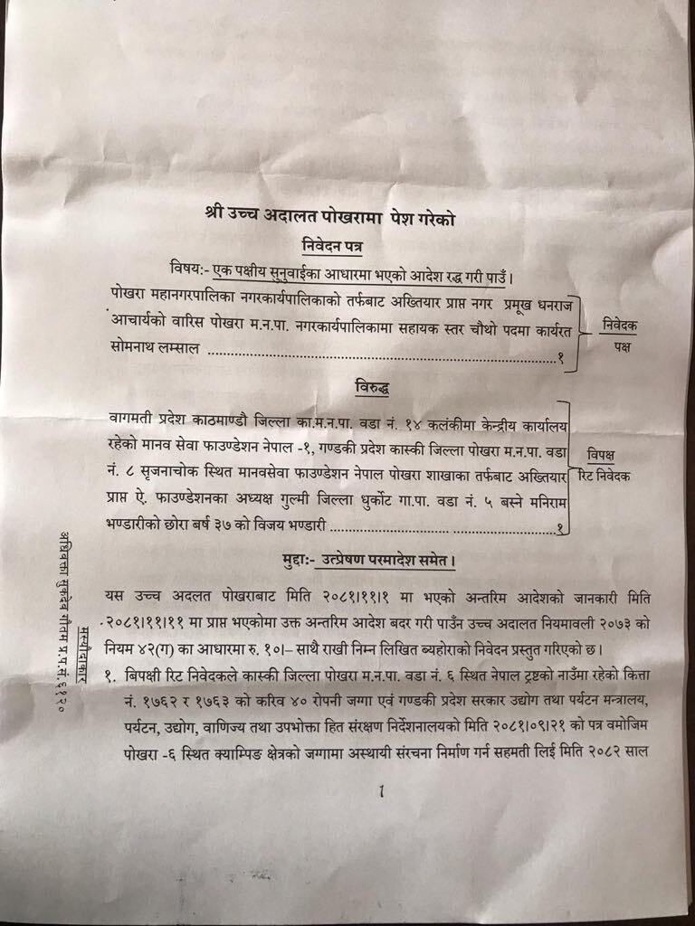 पोखरा महानगरको निवेदन उच्च अदालतमा दर्ता: कोटिहोम पक्षको अन्तरिम आदेश रद्द गर्न माग