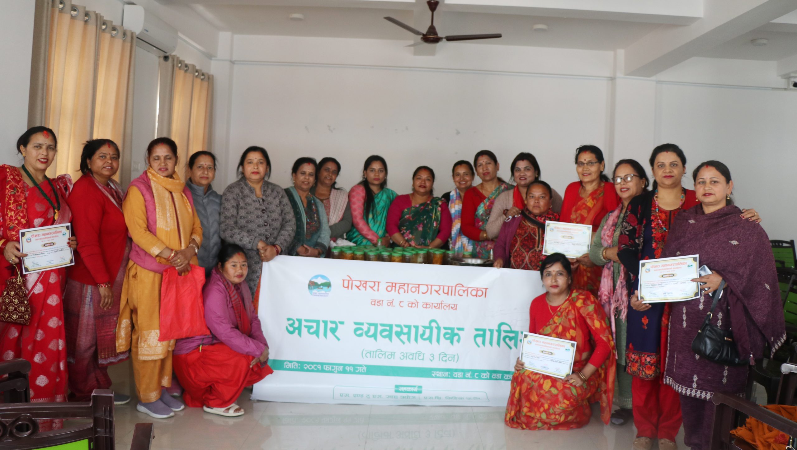पोखरा महानगरपालिका वडा नं ८ ले वडाभित्रका २५ महिलालाई अचार बनाउने तालिम दिइएको छ । महिलालाई व्यवसायिक र स्वरोजगार बनाउने उद्देश्यले तालिम आयोजना गरिएको हो ।