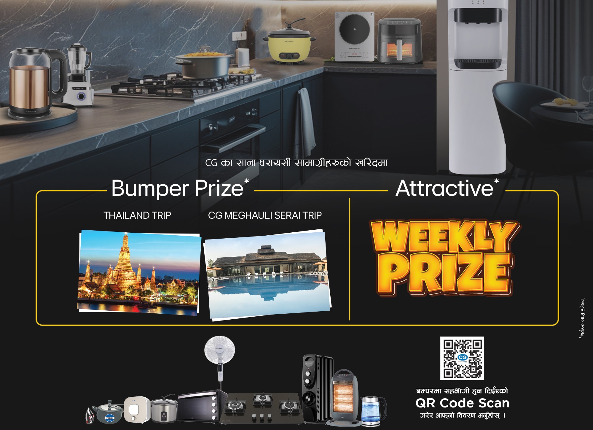 बम्पर पुरस्कारका रूपमा अभियानको अन्त्यमा भाग्यशाली एक जनालाई थाइल्यान्ड भ्रमण र सिजी मेघौली सेराईको विलासी यात्रा जित्ने अवसर दिइनेछ । यो योजना सिजी डिजिटलका आउटलेट र देशभरका च्यानल पार्टनरमार्फत कार्यान्वयन गरिसकिएको कम्पनीले जनाएको छ । सिजी नेपालकै सबैभन्दा ठूलो इलेक्ट्रोनिक्स ब्रान्डका रूपमा, सधैँ उच्च गुणस्तरका उत्पादनहरू उपलब्ध गराउँदै ग्राहकहरूको विश्वास जित्न सफल रहँदै आएको छ ।