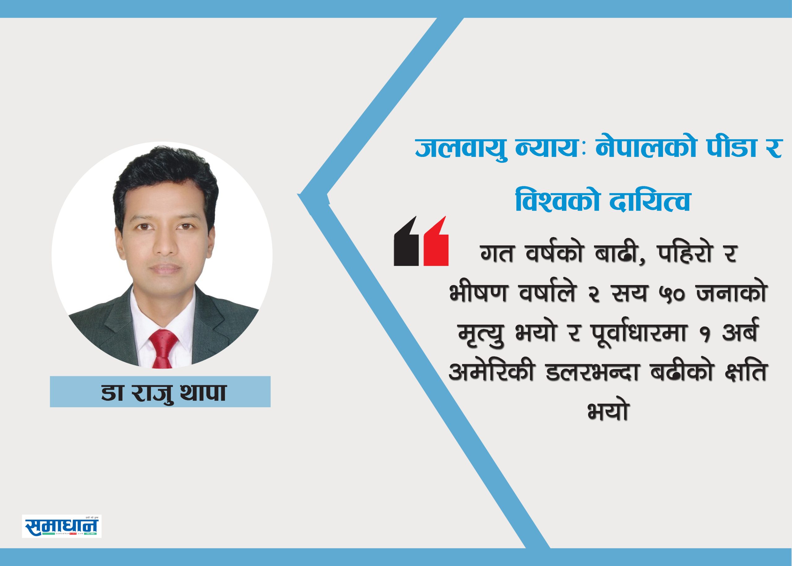 अन्त्यमा, जलवायु न्याय केबल सहानुभूतिको मुद्दा होइन, यो जिम्मेवारीको प्रश्न हो । नेपालजस्ता मुलुकले पाएको असरको न्यायोचित क्षतिपूर्ति, अनुकूलन र भविष्यको सुरक्षाका लागि नीतिगत दृढता, अन्तरराष्ट्रिय ऐक्यबद्धता र स्थानीय समावेशी कार्यान्वयन अपरिहार्य छ । जलवायु न्याय सुनिश्चित नगरेसम्म न त विकास सम्भव छ, न नै शान्ति, समृद्धि र भविष्यको अस्तित्व । लेखक पिपिनेट नेपालका अध्यक्ष तथा विपद् व्यवस्थापनका क्षेत्रका अभियन्ता हुन् ।