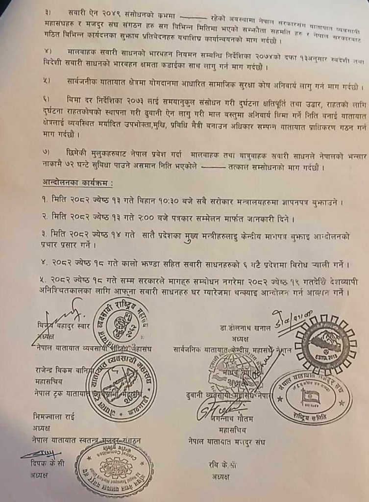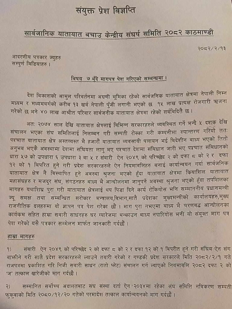 नेपाल यातायात व्यवसायी राष्ट्रिय महासंघ, नेपाल यातायात स्वतन्त्र मजदुर संघ, नेपाल यातायात मजदुर संघ, अखिल नेपाल यातायात मजदुर संघ, सार्वजनिक यातायात केन्द्रीय महासंघ र एकीकृत ट्रेड युनियन महासंघ गण्डकी लगायतका आठ संगठनहरूले संयुक्त रूपमा पत्रकार सम्मेलन गरी १७ बुँदे मागपत्र सार्वजनिक गरेका छन्। मागहरूमा निजी सवारीसाधनलाई सार्वजनिक सवारीसरह यात्रु ओसारपसार गर्न दिने व्यवस्था खारेज गर्नुपर्ने, सार्वजनिक सवारीको आयु सीमा हटाउनुपर्ने, राइड सेयरिङ सेवालाई कानुनी मान्यता नदिनुपर्ने लगायतका विषयहरू समेटिएका छन्।