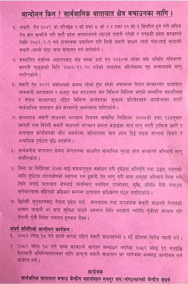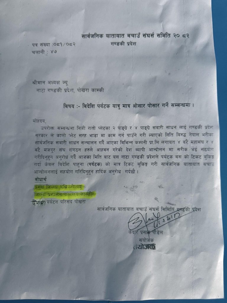 पत्रमा भनिएको छ, “नेपालभर सार्वजनिक यातायात सञ्चालन गर्दै आएका विभिन्न कम्पनी प्रा.लि., महासंघ र मजदुर संगठनहरूले आह्वान गरेको देशव्यापी आन्दोलनमा सहभागी भई सहयोग गरिदिनुहुन अनुरोध गर्दै, आजदेखि केवल विदेशी पर्यटकको मात्र टिकट बुकिङ गरी आन्दोलनलाई साथ दिनुहोला।”