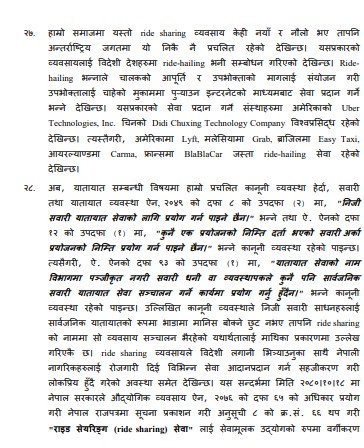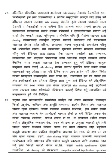 सवारी तथा यातायात व्यवस्था ऐन, २०४९ ले निजी सवारीसाधनलाई सार्वजनिक यातायातका रूपमा प्रयोग गर्न प्रतिबन्ध लगाए पनि राइड सेयरिङले सेवा सुविधा र पहुँच विस्तारमा योगदान गरेकाले यसलाई व्यवस्थित गर्न कानुनी संरचना आवश्यक पर्ने अदालतको विश्लेषण छ ।