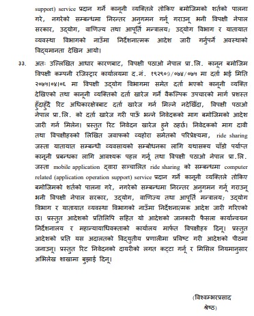निवेदकले अधिवक्ताद्वयले राइड सेयरिङ सेवाको वैधानिकता र नियमनको आवश्यकता औंल्याउँदै दर्ता खारेजी माग गरेकामा सर्वोच्चले सो मुद्दा खारेज गर्दै राइड सेयरिङ सेवालाई व्यवस्थित गर्न कानुनी संरचना निर्माण गर्न निर्देशनात्मक आदेश जारी गरेको छ ।