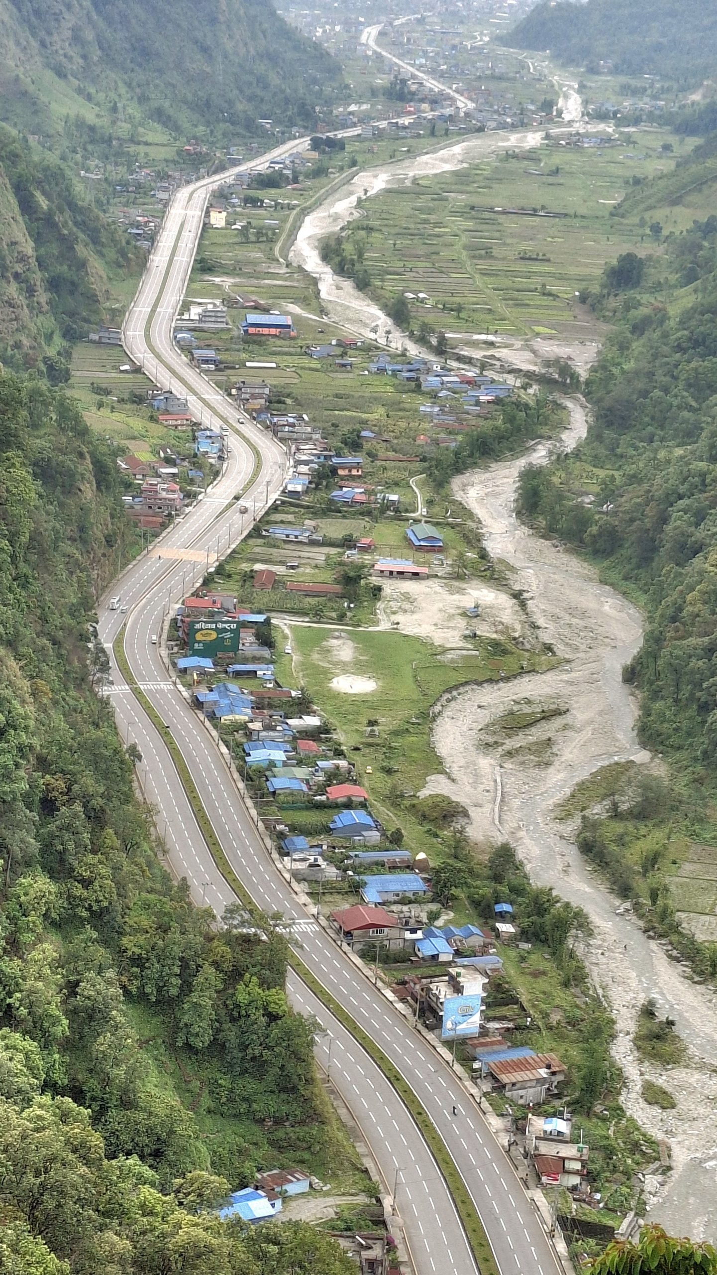 पोखरा महानगरपालिका–२५ स्थित मध्यपहाडी लोकमार्ग र सुईखेत खोला तथा आसपासमा रहेका फेदी र सुईखेत बजार। तस्बिर : कृष्ण दवाडी/रासस