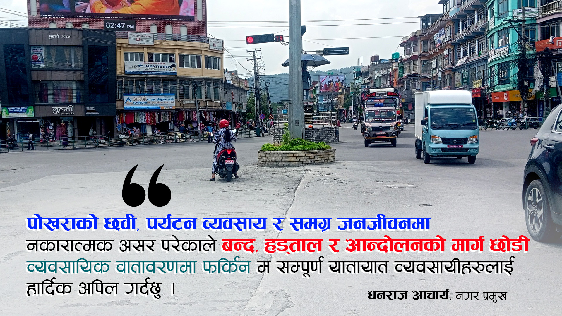 पछिल्ला केही दिनयता पोखरामा सार्वजनिक यातायात व्यवसायीहरूले जारी राखेको आन्दोलनका कारण जनजीवन प्रभावित भएपछि पोखरा महानगरपालिकाका प्रमुख धनराज आचार्यले आन्दोलनको मार्ग परित्याग गरी वार्ता र संवादबाट समाधान खोज्न व्यवसायीहरूलाई आग्रह गरेका छन् ।