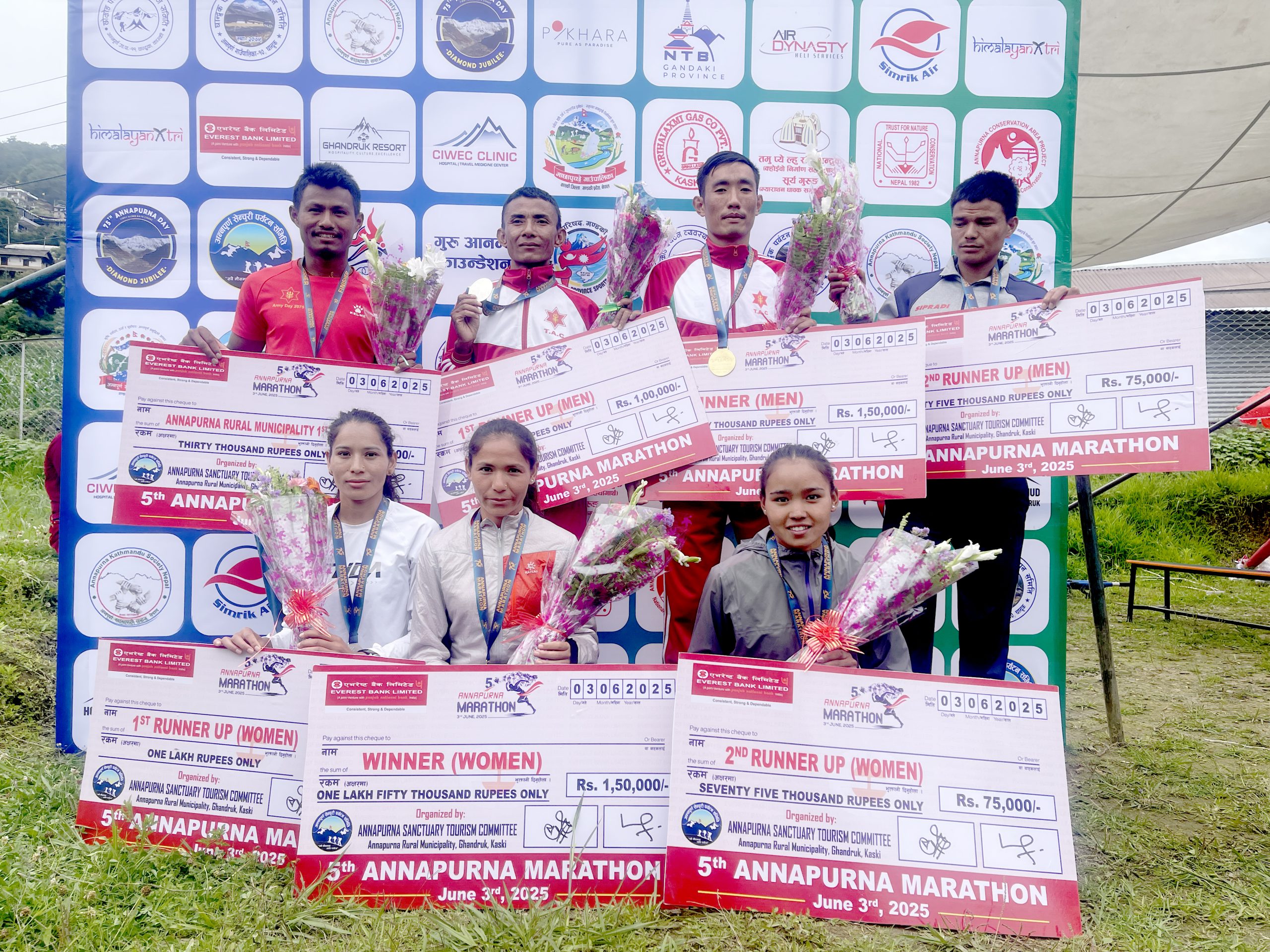 अन्नपूर्ण आरोहणको हिरक महोत्सवको अवसरमा भएको पाँचौं संस्करणको अन्नपूर्ण म्याराथन उपाधि पुरुषतर्फ त्रिभुवन आर्मी क्लबका तिलकबहादुर सुनुवार र महिलातर्फ सुनमाया बुढाले जितेका छन् ।