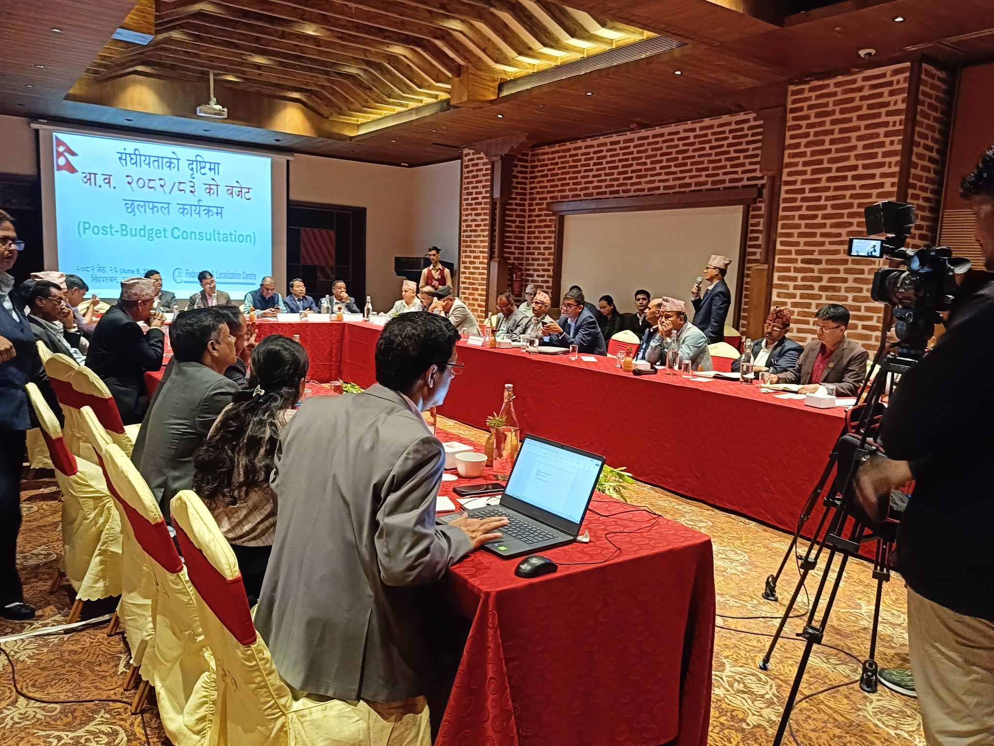 संघीय सरकारको बजेटमाथि फेडरल एन्ड लोकलाइजेसन सेन्टरले सोमबार काठमाडौंमा ‘संघीयताको सन्दर्भमा बजेटपछिको परामर्श’ शीर्षकमा कार्यक्रम आयोजना गरेको छ ।