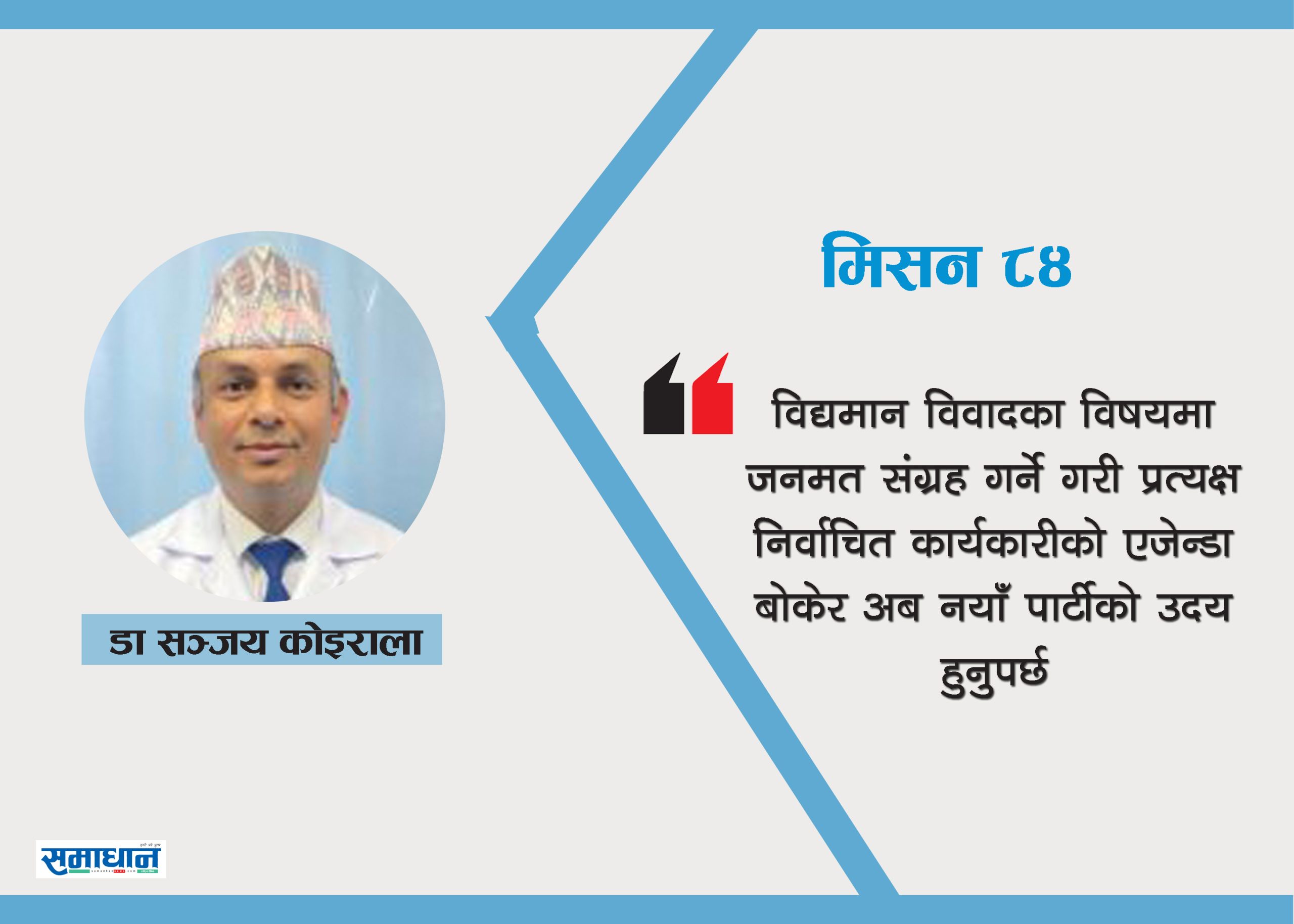 नेता सुध्रिए देश बन्छ भन्ने हामी आफूले चाहिं सुधारको प्रयास गर्न चाहन्नौं । नेता सुधार्ने हामी आफैं हौँ भनेर बुझ्न हामीले सकेका छैनौँ । लोकतन्त्रमा जनता नै मुख्य शक्ति केन्द्रमा रहनुपर्नेमा हामी अझै पनि नेताकै पिछलग्गु भइरहेका छौँ । अब मिसन ८४ को दौड सुरु भएको छ । कुनै न कुनै तवरले नयाँ, पुराना दल सबैको दौडधूप चलिरहेकै छ ।