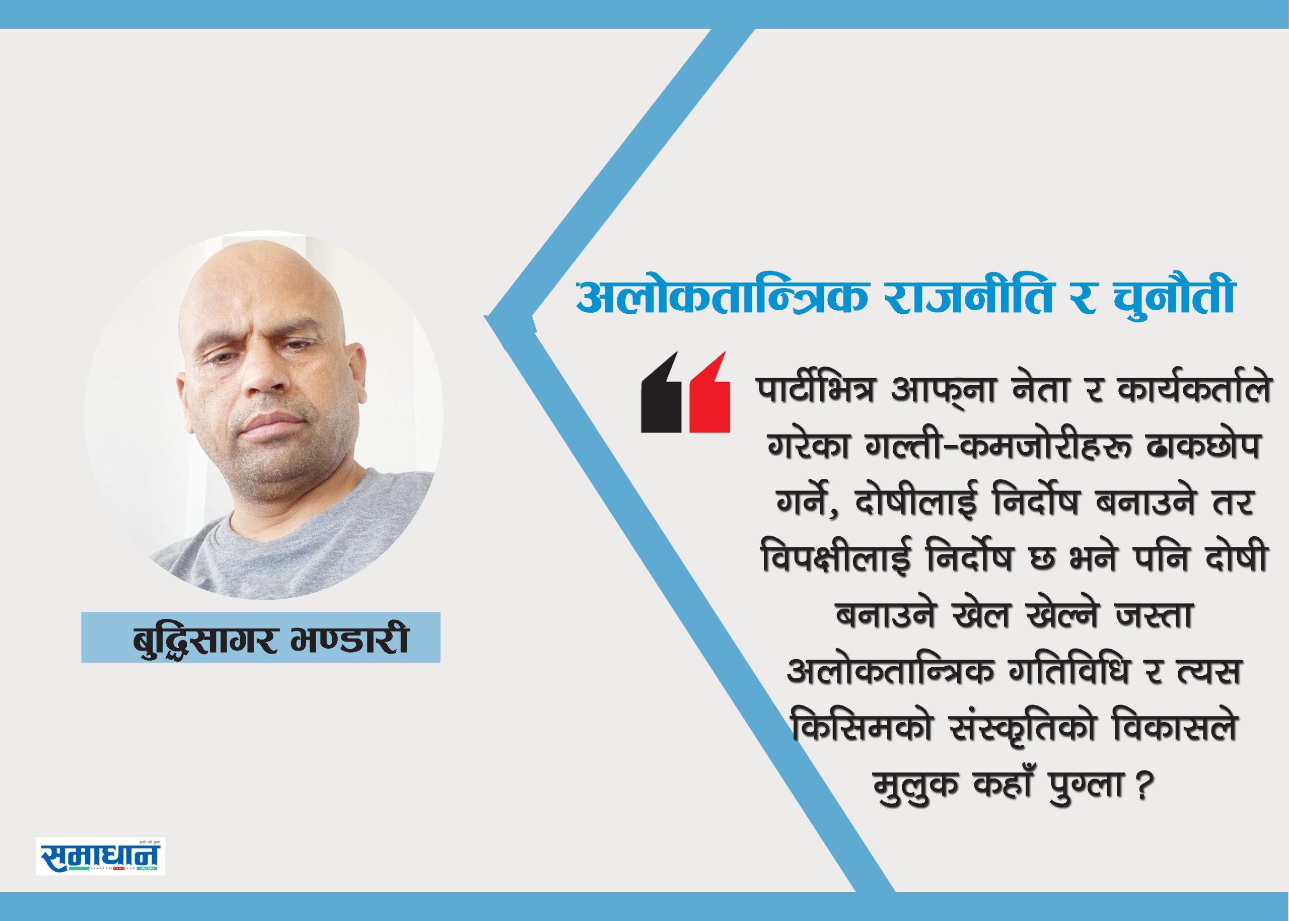 पार्टीभित्र आफ्ना नेता र कार्यकर्ताले गरेका गल्ती–कमजोरीहरू ढाकछोप गर्ने, दोषीलाई निर्दोष बनाउने तर विपक्षीलाई निर्दोष छ भने पनि दोषी बनाउने खेल खेल्ने जस्ता अलोकतान्त्रिक गतिविधि र त्यस किसिमको संस्कृतिको विकासले मुलुक कहाँ पुग्ला?