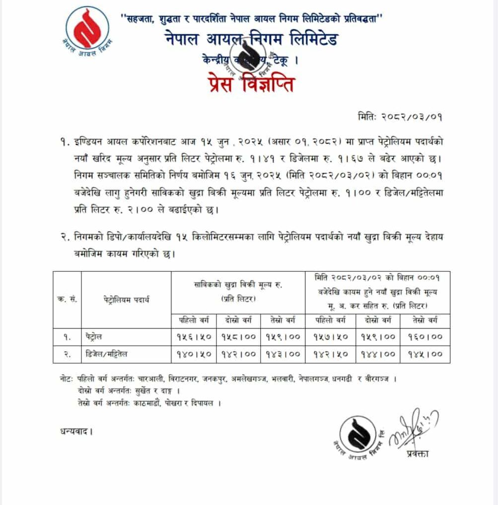 निगमले बढेको मूल्य आइतबार रातिबाट लागु हुने जनाएको छ। यो मूल्य समायोजन इण्डियन आयल कर्पोरेशनबाट १५ जुनमा प्राप्त नयाँ मूल्यका आधारमा गरिएको हो।
