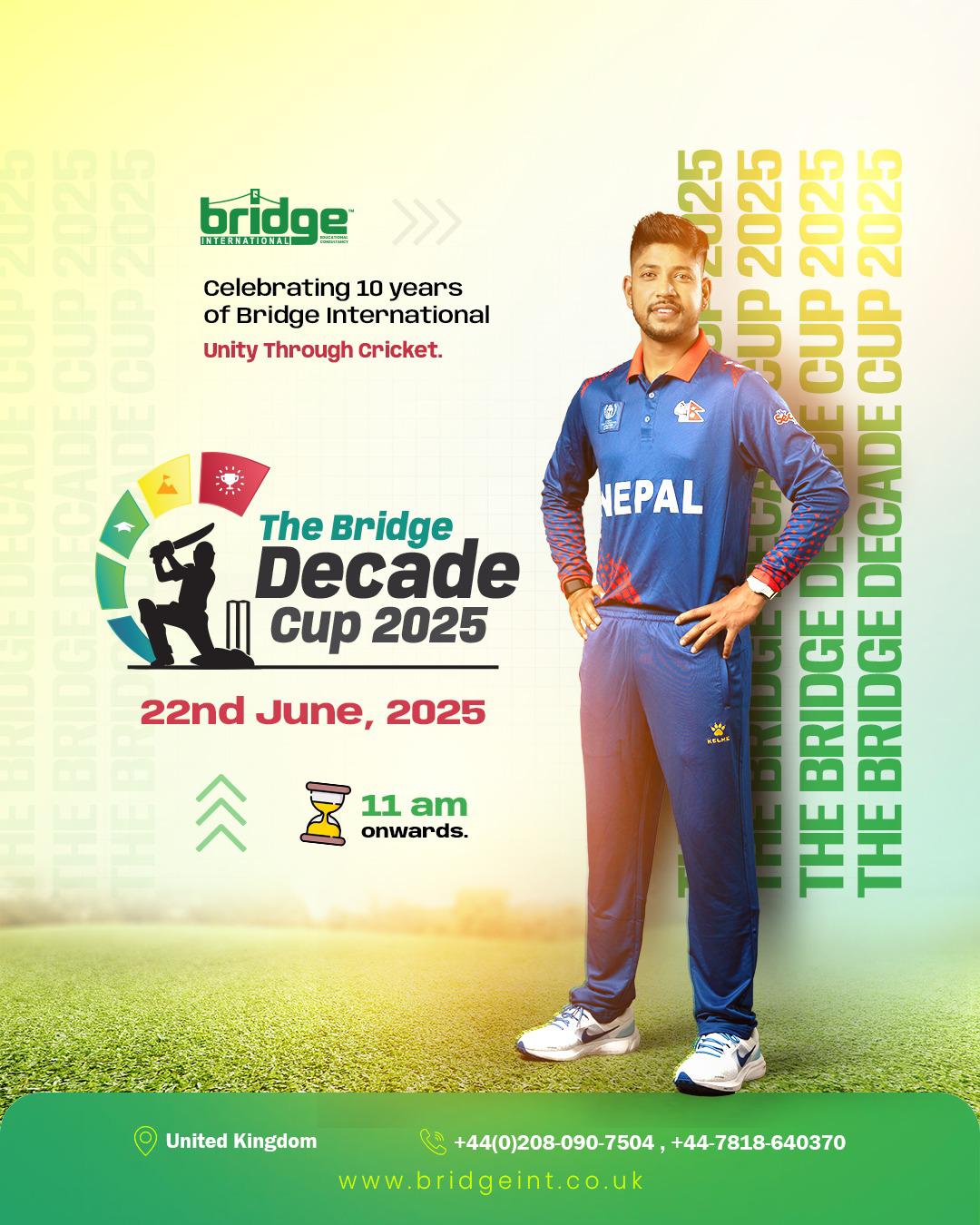लन्डन । ब्रिज इन्टरनेशनल कन्सल्टेन्सीले आफ्नो १०औँ वार्षिकोत्सव विशेष रूपमा मनाउने घोषणा गर्दै “Bridge Decade Cup 2025” आयोजना गर्न लागेको छ। आउँदो असार ७ गते आइतबार (२२ जुन २०२५) युकेको डेवाइजिस क्रिकेट मैदानमा ब्रिज इलेभेन (Bridge XI) र डेवाइजिस क्रिकेट क्लबबीच मैत्रीपूर्ण क्रिकेट खेल हुनेछ।