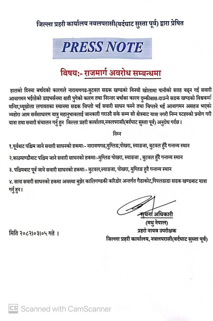 लगातारको वर्षाका कारण आएको बाढी र पहिरोले पूर्व-पश्चिम राजमार्गको नारायणगढ-बुटवल सडकखण्ड अवरुद्ध भएको छ। जिल्ला प्रहरी कार्यालय, नवलपरासी (बर्दघाट सुस्ता पूर्व) ले बिहीबार एक सूचना जारी गर्दै यात्रुहरूलाई वैकल्पिक मार्ग प्रयोग गर्न आग्रह गरेको छ।