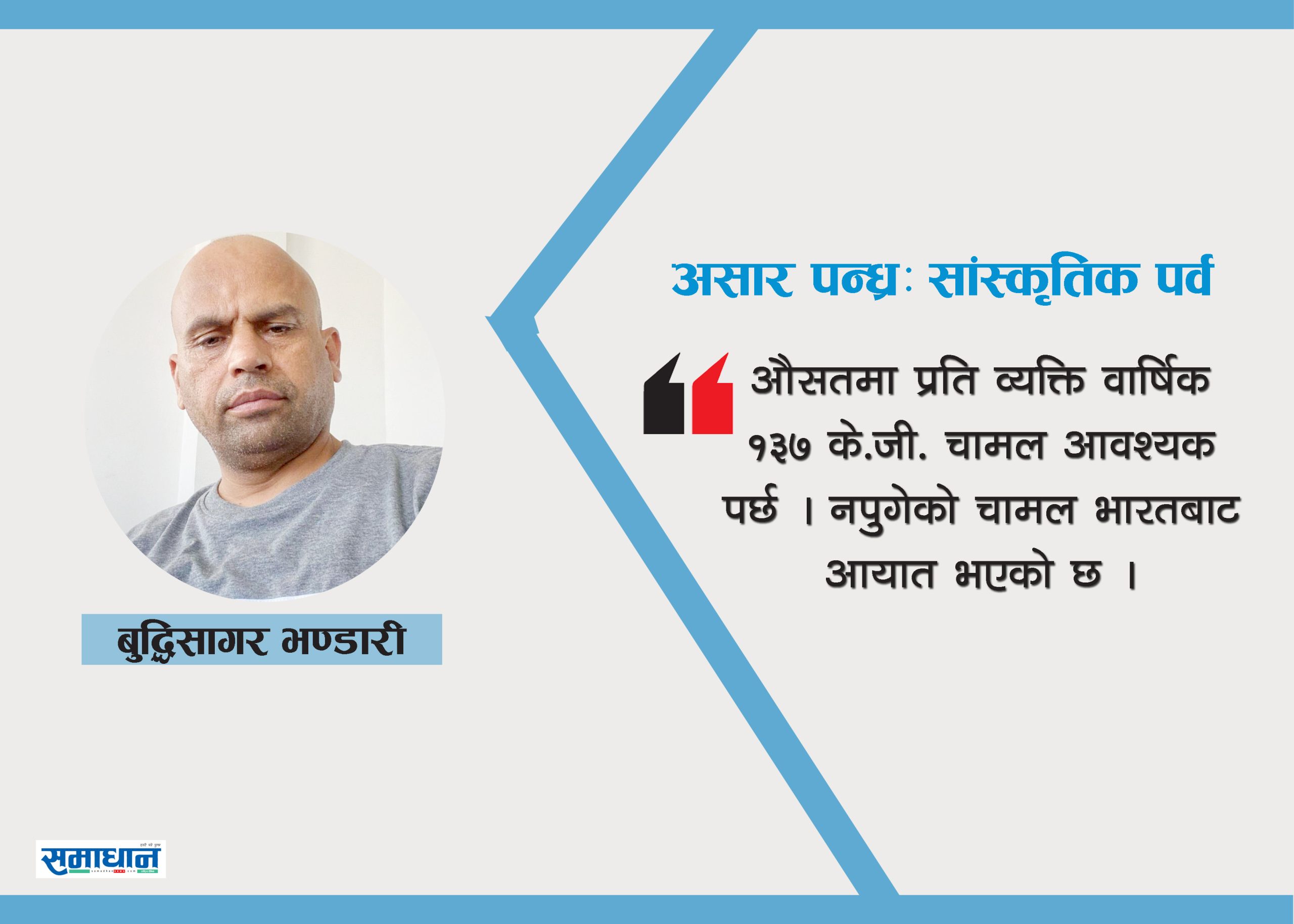 वार्षिक रुपमा धान कति परिमाणमा उत्पादन भएको छ? कति खपत हुन्छ? हाम्रो उत्पादनले आत्मनिर्भर बन्न सक्यौँ कि सकेनौँ? एक वर्षमा भारतबाट कति चामल आयात भएको छ? सोको समीक्षा गरी तदनुसार योजना बनाई कृषि पेशालाई आधुनिकीकरण र व्यवसायीकरण गर्नुपर्ने अहिलेको मुख्य आवश्यकता हो । तब मात्र धान दिवसको वास्तविक औचित्यता र महत्त्व रहन्छ । धूमधाम बाजागाजासहित धान दिवस मनाउने, धान दिवसको रूपमा भव्य सांस्कृतिक कार्यक्रमहरू गर्ने, मन्त्री र ठूला ओहोदाका मान्छेहरू आएर भाषण गर्ने, धान–बिरोको माला लगाएर हिलोमा खेलेको तस्बिर खिच्दैमा ‘राष्ट्रिय धान दिवस’ को वास्तविक औचित्यता हुन सक्दैन ।