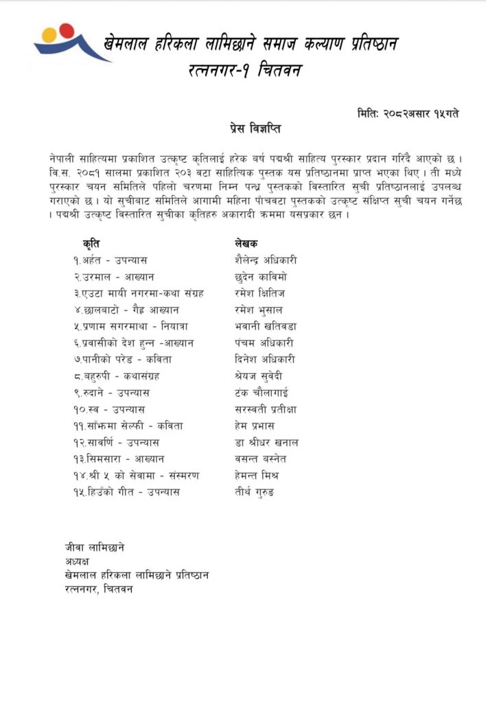 पद्मश्री साहित्य पुरस्कारको विस्तृत सूची सार्वजनिक, १५ पुस्तक छानिए (सूचीसहित)