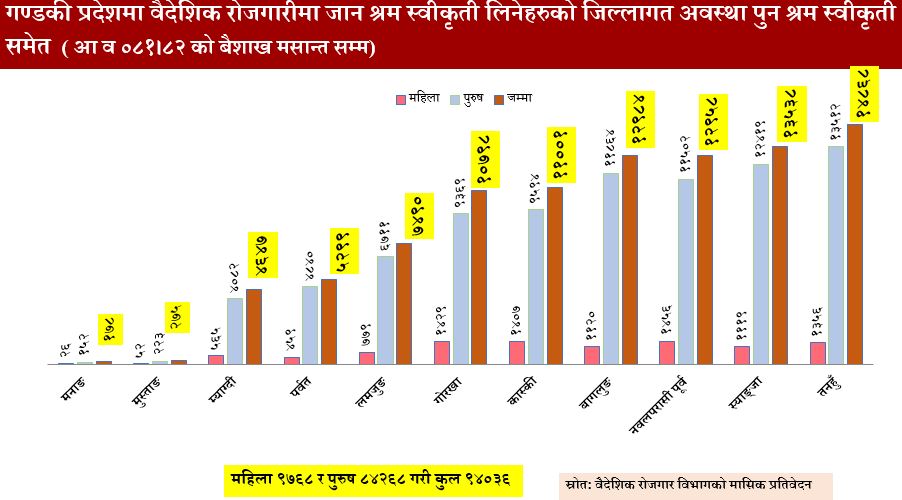 उक्त तथ्यांकमा पुनः श्रम स्वीकृति लिएका व्यक्तिहरू समेत समावेश छन् । वैदेशिक रोजगारीमा जाने क्रम तीव्र रहेको देखिँदा गण्डकी प्रदेशका अधिकांश युवाशक्ति अझै पनि रोजगारीका लागि विदेशिन बाध्य रहेको यो तथ्यांकले प्रष्ट देखाएको छ । विशेषगरी मलेसिया, खाडी मुलुकहरू, दक्षिण कोरिया, युरोपेली मुलुकहरूतर्फ श्रमिक रोजगारीका लागि पुगेका छन् । सीमित घरेलु रोजगारी अवसर, सीप र सूचनाको अभाव, आर्थिक अवस्थाजस्ता कारण विदेश जाने क्रम रोकिएको छैन । समग्र नेपालकै अवस्था हेर्दा प्रत्येक वर्ष झण्डै ५ लाख युवा श्रम बजारमा प्रवेश गर्छन् । तर देशभित्र पर्याप्त रोजगारीको अवसर नहुँदा वैदेशिक रोजगारी नै एकमात्र विकल्पजस्तो बनेको छ । वैदेशिक रोजगार विभागका अनुसार अहिलेसम्म झण्डै ८५ लाख नेपालीले श्रम स्वीकृति लिई विदेशमा काम गरिसकेका छन् । देशभित्र उत्पादक श्रम बजार सिर्जना गर्न नसक्दा शिक्षितदेखि अर्धशिक्षित र सीपविहीन श्रमिकसम्म वैदेशिक रोजगारीतर्फ आकर्षित भइरहेका छन् । गण्डकी प्रदेशजस्तो भौगोलिक र पर्यटकीय रूपमा समृद्ध प्रदेशमा समेत वैदेशिक रोजगारीको लहर नरोकिएको देखिनु चुनौतीपूर्ण अवस्था हो ।