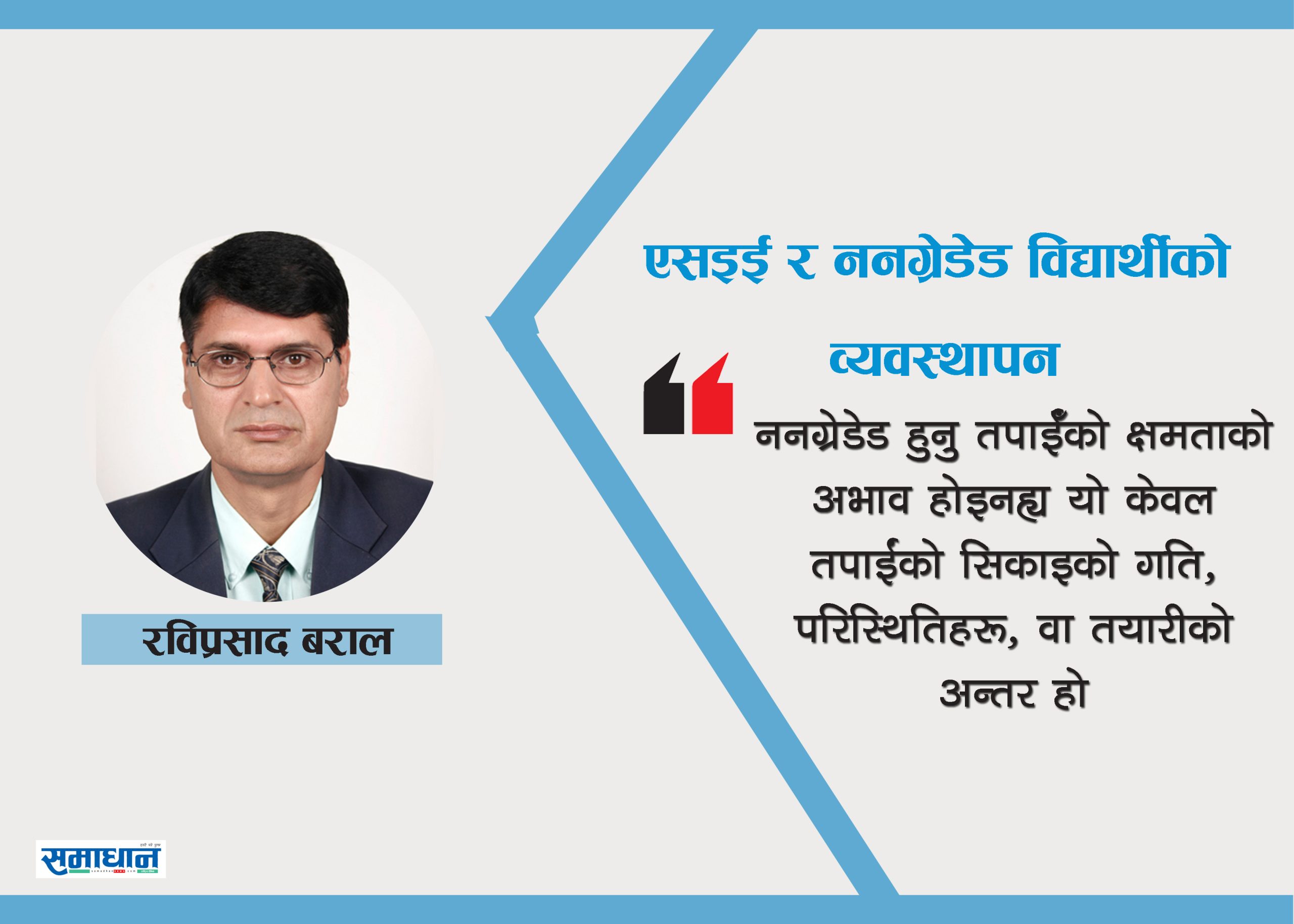 ननग्रेडेडको अर्थ फेल होइनः ननग्रेडेड अर्थात् मूल्यांकनमा न्यूनतम आवश्यकता पूरा नगरेका र कक्षा ११ पढ्न योग्य नठहरिनु हो । तर यसलाई सजिलै ‘फेल’ भनी ठहर गरिनु, शिक्षाको मानव केन्द्रित दृष्टिकोणसँग मेल खाँदैन । यसको सट्टा, हामीले शिक्षा प्रणालीमा सुधार गर्दै विद्यार्थीको मनोबल बलियो बनाउने दिशामा सोच्नुपर्ने बेला आएको छ ।