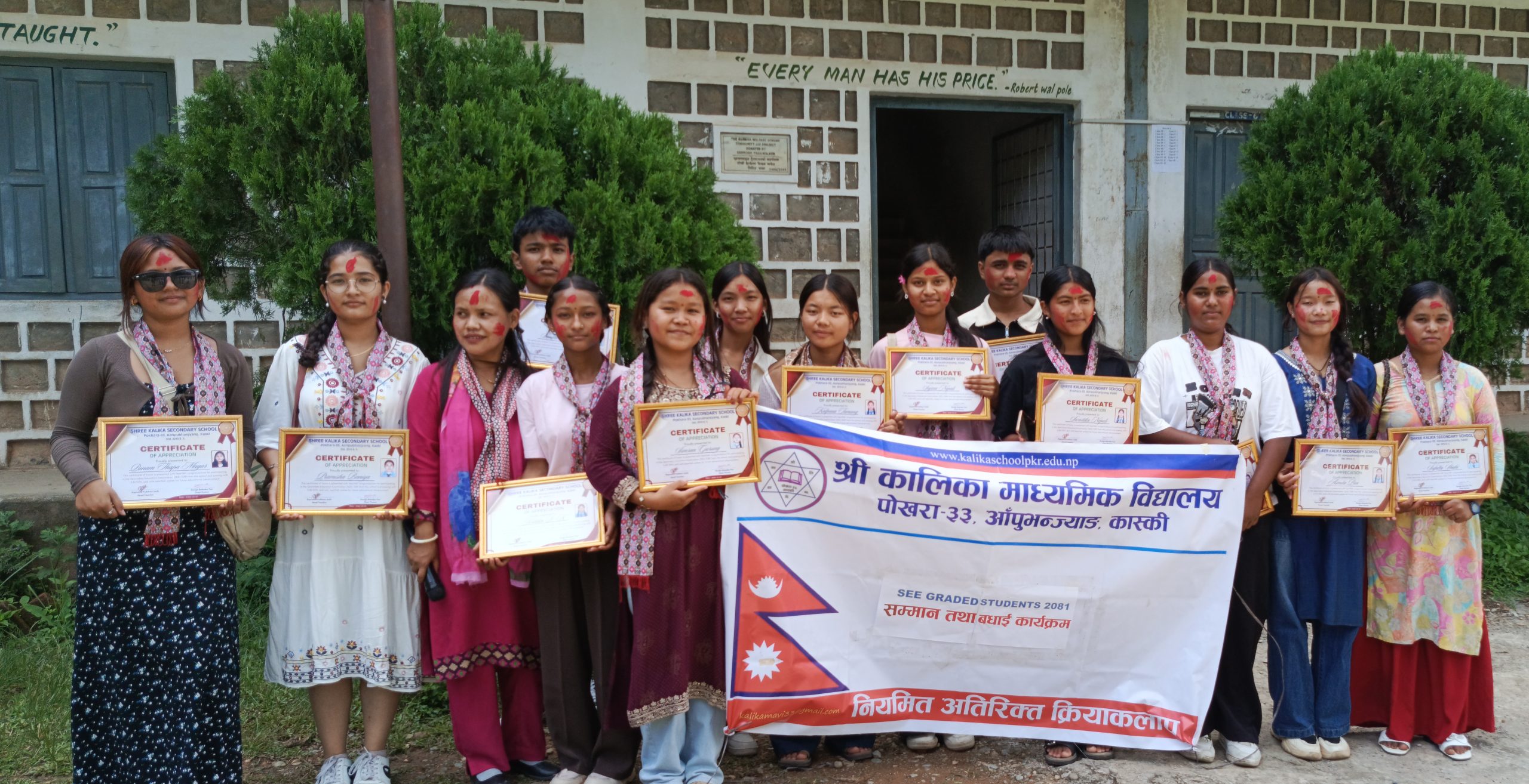 विद्यालय व्यवस्थापन समिति अध्यक्ष गंगाबहादुर पुनको अध्यक्षतामा भएको कार्यक्रममा पोखरा महानगरपालिका वडा नम्बर ३३ का वडा सदस्य प्रकाश कार्की, प्रधानाध्यापक रुपिन्द्र प्रभावी, अध्यक्ष पुन लगायतले सम्मान गरेका थिए । विद्यार्थीलाई बधाई दिँदै वडा सदस्य कार्कीले कालिकाले हासिल गरेको उपलब्धि समग्र ३३ नम्बर वडाकै गौरवको विषय भएको बताए ।