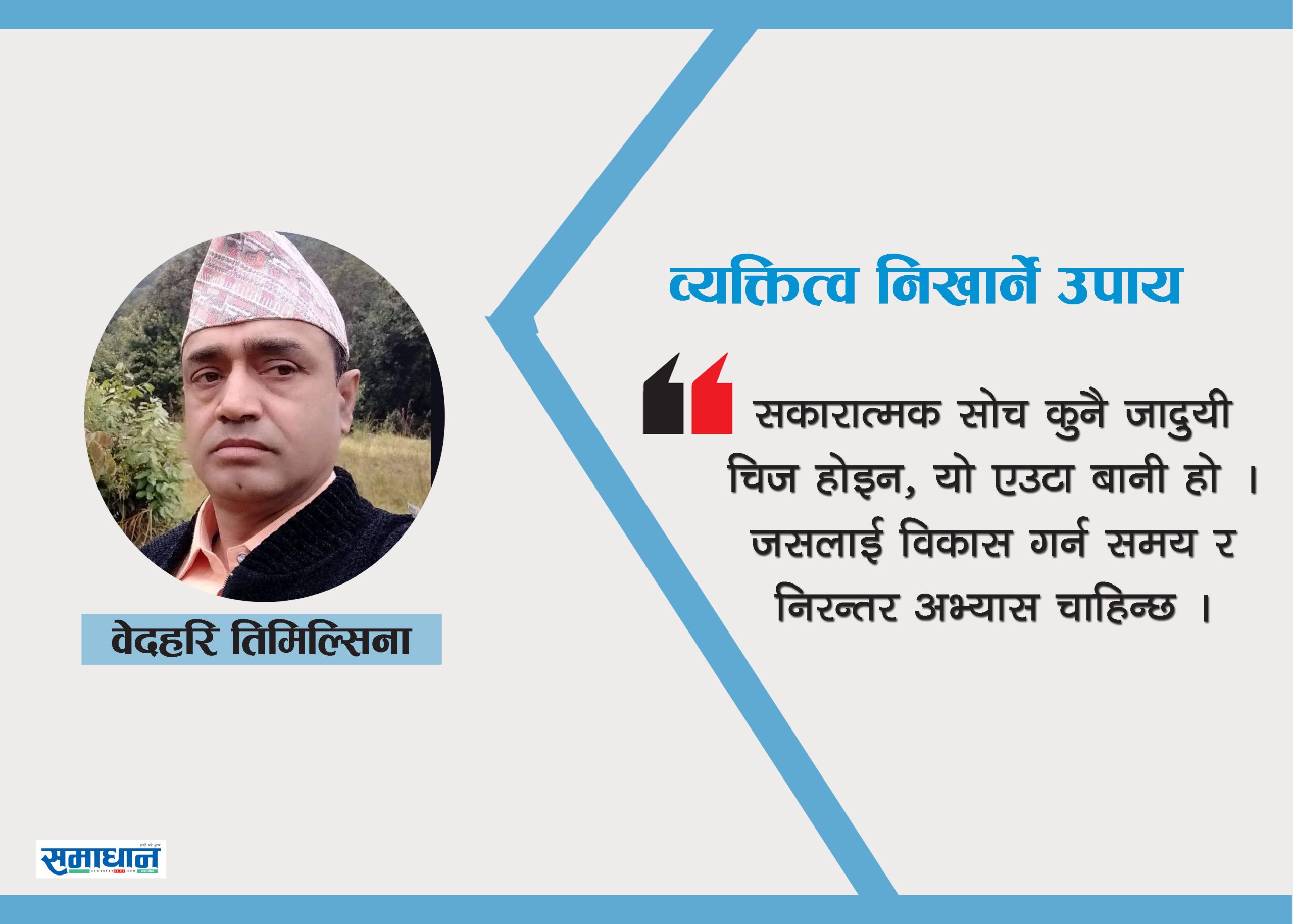 हाम्रो व्यक्तित्व जीवनभर विकास हुने एउटा गतिशील प्रक्रिया हो । यो हाम्रो आनुवंशिकता (जुन हामीले आफ्ना पुर्खाबाट पाउँछौँ), हाम्रो वातावरण (हामी हुर्किएको समाज र परिवेश), हाम्रा सामाजिक सम्बन्धहरू र विशेष गरी हामीले कसरी सोच्छौँ भन्ने कुराको मिश्रणले बन्छ । सकारात्मक सोचले हाम्रो व्यक्तित्व विकासमा निम्न महत्त्वपूर्ण तरिकाले मद्दत गर्छः