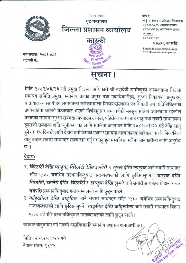 जिल्ला प्रशासन कार्यालय, कास्कीले मनसुन सक्रिय भएसँगै बाढी र पहिरोको जोखिमलाई मध्यनजर गर्दै जिल्लाका केही ग्रामीण तथा पर्यटकीय सडकखण्डमा सवारीसाधन सञ्चालनको समय तोकेको छ। मानवीय र भौतिक क्षति न्यूनीकरण गर्ने उद्देश्यले प्रशासनले यही असार २५ गतेदेखि १५ दिनका लागि अत्यावश्यक बाहेकका सार्वजनिक तथा निजी सवारी साधनहरूमा समय तालिका लागू गरेको हो।