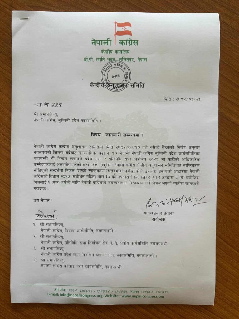 अनुशासन समितिको पत्रमा भनिएको छ, ‘स्पष्टीकरण सन्तोषजनक नदेखिएको र प्राप्त प्रमाणका आधारमा कांग्रेसको विधान २०१७ (संशोधनसहित) को धारा ३४ को उपधारा १ (क), (ख), (घ) र उपधारा ८ (ङ) अनुसार महामन्त्री खनाललाई १ वर्षका लागि पार्टी सदस्यताबाट निष्कासन गरिएको छ।’