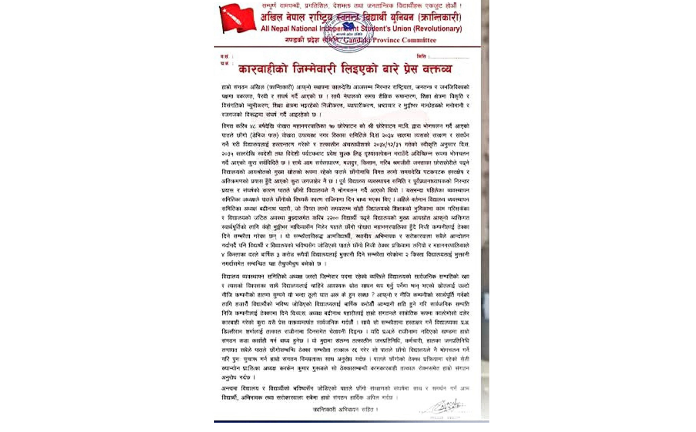 अखिल क्रान्तिकारीले जारी गरिएको प्रेस विज्ञप्तिमा विद्यालयमा व्यापक अनियमितता, अपारदर्शिता र आर्थिक दुर्व्यवहार भएको आरोप लगाइएको छ। विज्ञप्तिमा भनिएको छ, “विगत लामो समयदेखि अध्यक्षको एकल निर्णय, स्रोत साधनको दुरुपयोग, जनप्रतिनिधि र स्थानीय नेताहरूको संरक्षणमा भ्रष्टाचार मौलाउँदै आएको छ।”
