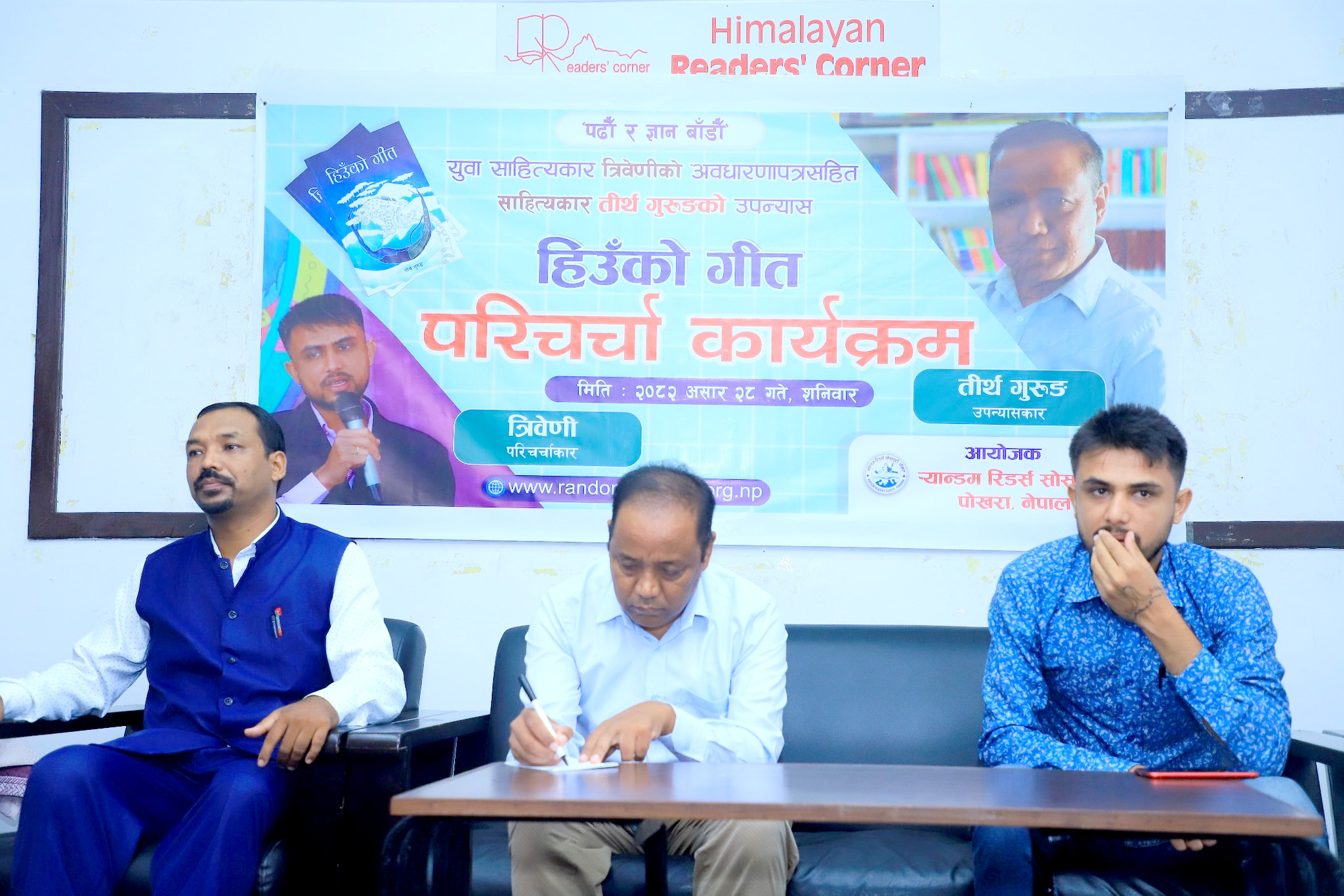 र्यान्डम रिडर्स सोसाइटीको १ सय १८ औं नियमित कार्यक्रममा शनिवार साहित्यकार तीर्थ गुरुङको उपन्यास ‘हिउँको गीत’को चर्चा गरिएको छ । सोसाइटीले हरेक महिनाको अन्तिम शनिवार कुनै कृति वा विषयमाथि परिचर्चा गर्दै आएको छ ।