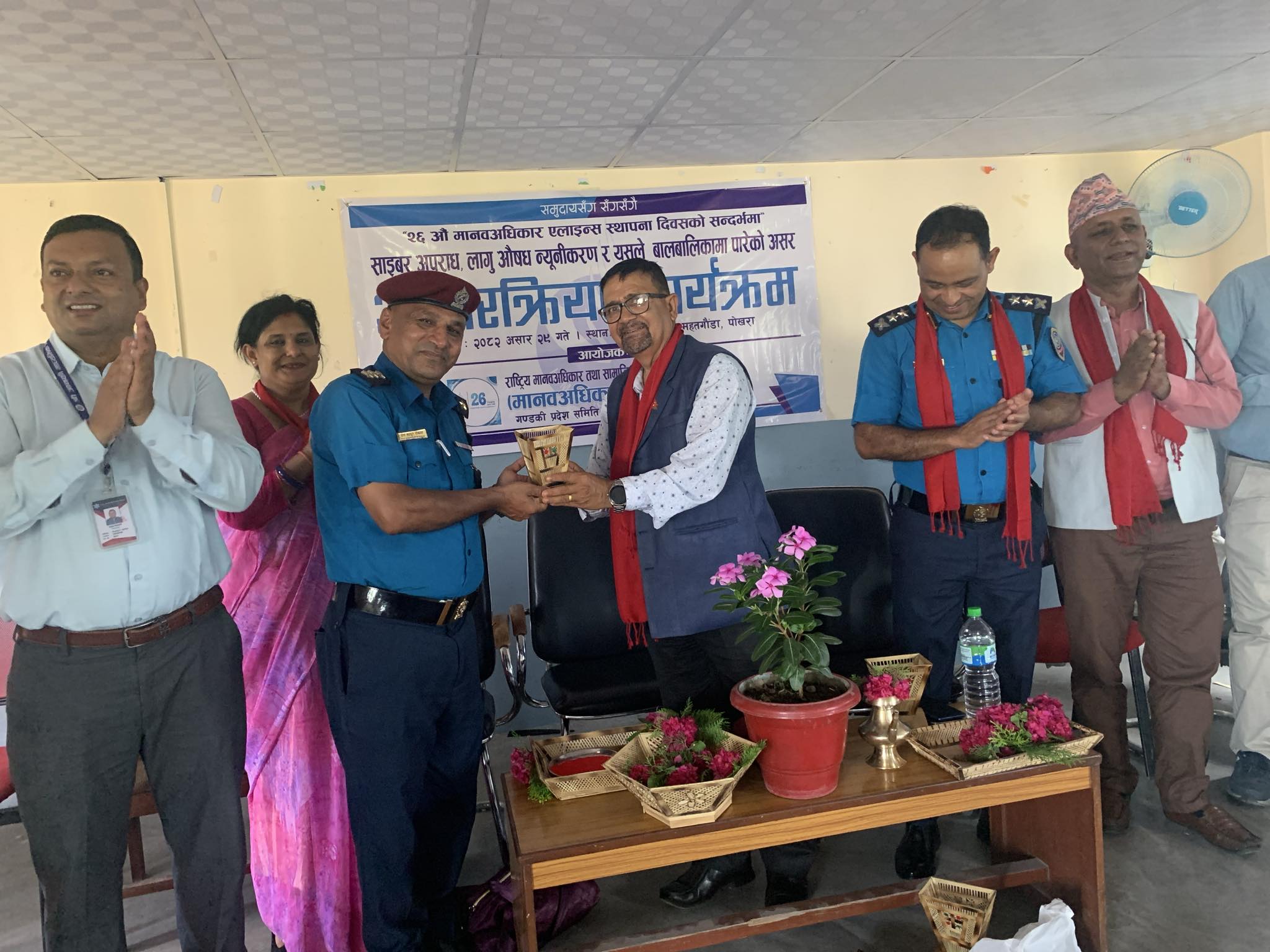 जिल्ला प्रहरी कार्यालय कास्कीका प्रमुख प्रहरी उपरीक्षक श्यामबाबु ओलियाले कार्यक्रम उद्घाटन गर्दै इन्टरनेटको बढ्दो पहँुचले साइबर अपराधबाट धेरै बालबालिका प्रभावित भएको बताए । ‘गलत संगत र साथी भाइको लहै लहैमा लागेर बाल बालिका लागुऔषधको कुलतमा फस्न सक्छन्,’ उनले भने, ‘बालबालिकाले राम्रो साथीको संगत गर्न पर्छ । लागुऔषधको कुलतबाट जोगिन गलत व्यक्तिको संगत गर्नु हुँदैन ।’