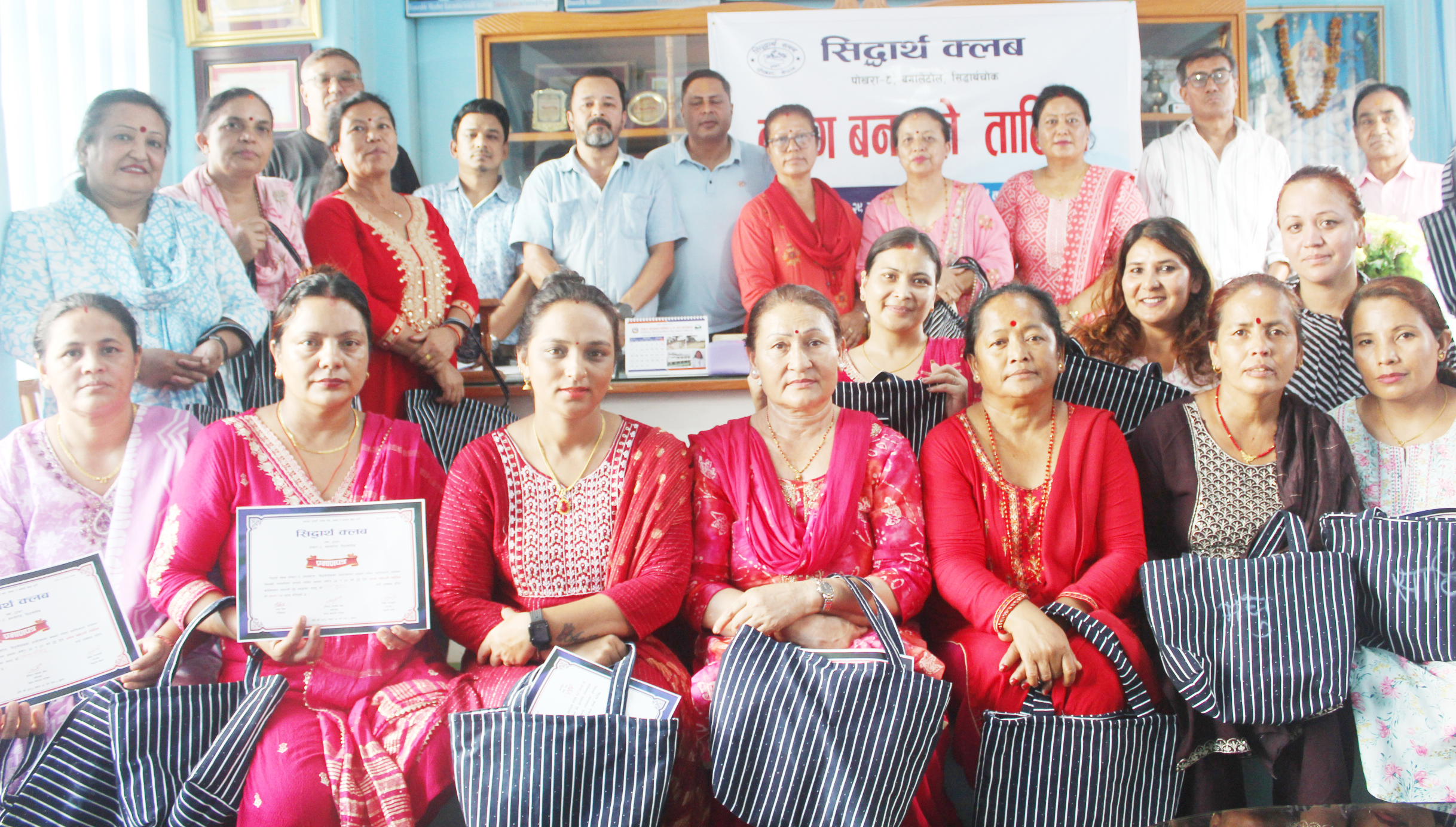 सिद्धार्थ क्लब पोखराले १६ जना महिलाको सहभागितामा ब्याग बनाउने तालिम क्लब सचिवालय भवन, सिद्धार्थचोकमा सम्पन्न गरेको छ । कार्यक्रममा मन्तव्य राख्दै क्लबका अध्यक्ष तथा कार्यक्रमका सभाध्यक्ष देवेन्द्र पराजुलीले तालिमले महिलाहरूलाई स्वरोजगारमा लाग्न र आर्थिक रुपमा आत्मनिर्भर बन्न प्रेरणा दिने विश्वास व्यक्त गरे ।