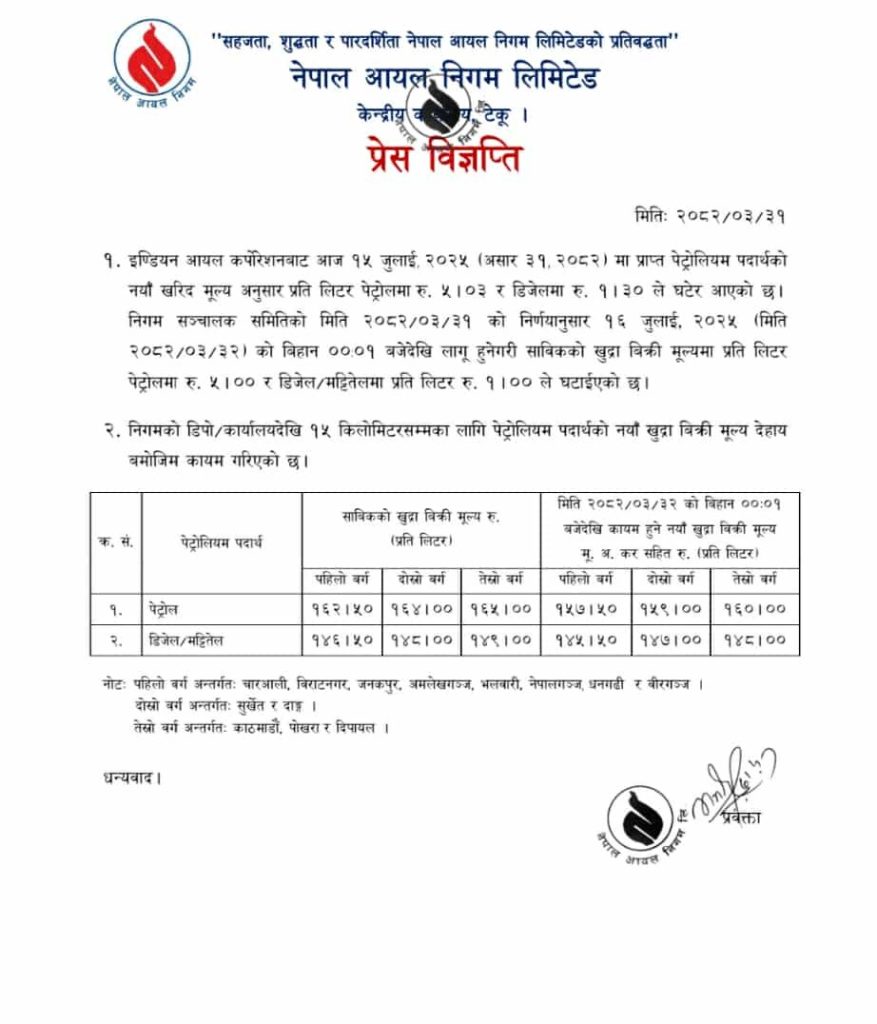 मङ्गलबार बेलुकी सूचना जारी गर्दै निगमले इन्डियन आयल कर्पोरेशनले असार ३१ मा पठाएको पेट्रोलियम पदार्थको नयाँ खरिद मूल्य अनुसार मूल्य घटाइएको जानकारी दिएको हो ।
