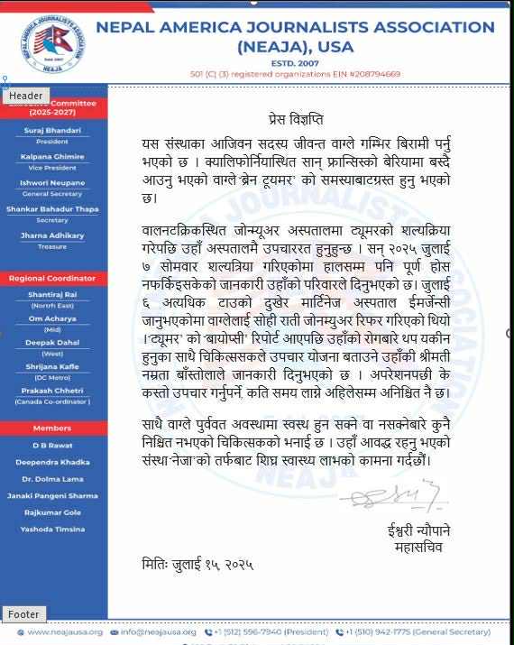 उनी आबद्ध संस्था ‘नेजा’ का महासचिव ईश्वरी न्यौपानेले विज्ञप्तिमार्फत उनको शीघ्र स्वास्थ्य लाभको कामना गरेका छन्।