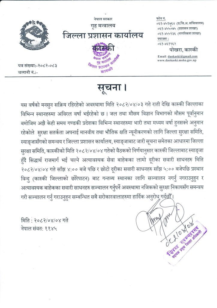 जिल्ला प्रशासन कार्यालय कास्कीले भारी वर्षा र सम्भावित जोखिमलाई मध्यनजर गर्दै सिद्धार्थ राजमार्ग हुँदै स्याङ्जातर्फ जाने सवारी साधन संचालनमा समय निर्धारण गरेको छ। कार्यालयले आइतबार सूचना जारी गर्दै साँझपछि तोकिएको समयमा अत्यावश्यक सेवाबाहेकका सवारी साधन चलाउन रोक लगाएको हो।