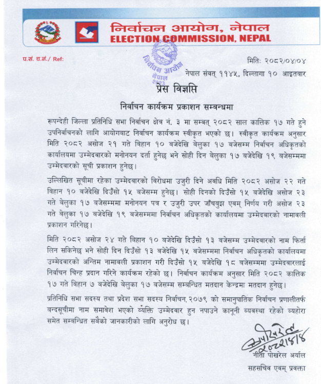 रूपन्देही-३ मा उपनिर्वाचनको मिति घोषणा, कात्तिक १७ मा मतदान हुने