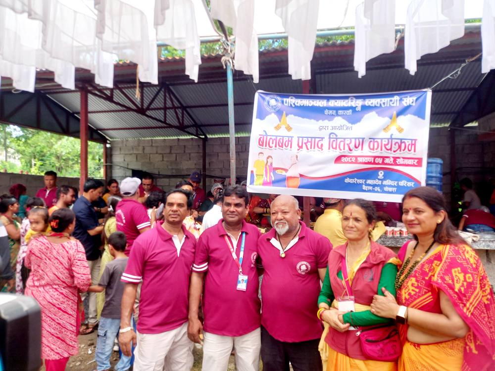 पश्चिमाञ्चल क्याटरिङ व्यवसायी संघले पोखरा महानगरपालिका वडा नं ६ मा रहेको केदारेश्वर महादेव मन्दिरमा श्रद्धालु भक्तजनहरुलाई प्रसाद वितरण गरेको छ ।