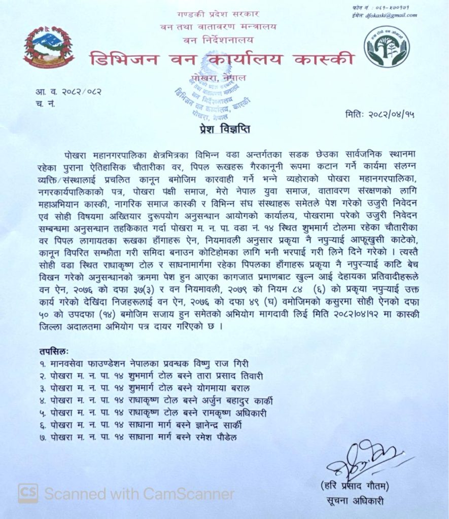 डिभिजन वन कार्यालयले बिहीबार विज्ञप्ति जारी गर्दै पोखरा महानगरपालिका-१४ का विभिन्न स्थानमा रहेका सार्वजनिक चौतारी र सडक किनारका रुखहरू गैरकानुनी रूपमा कटानमा संलग्न व्यक्तिहरूमाथि मुद्दा चलाइएको जनाएको हो । केही महिनाअघि पोखरामा आयोजित कोटिहोमका लागि दाउरा (समिदा) आवश्यक परेको भन्दै शुभमार्ग टोल, राधाकृष्ण टोल र साधनामार्गका पुराना वर-पिपलका रुखहरू काटिएका थिए ।