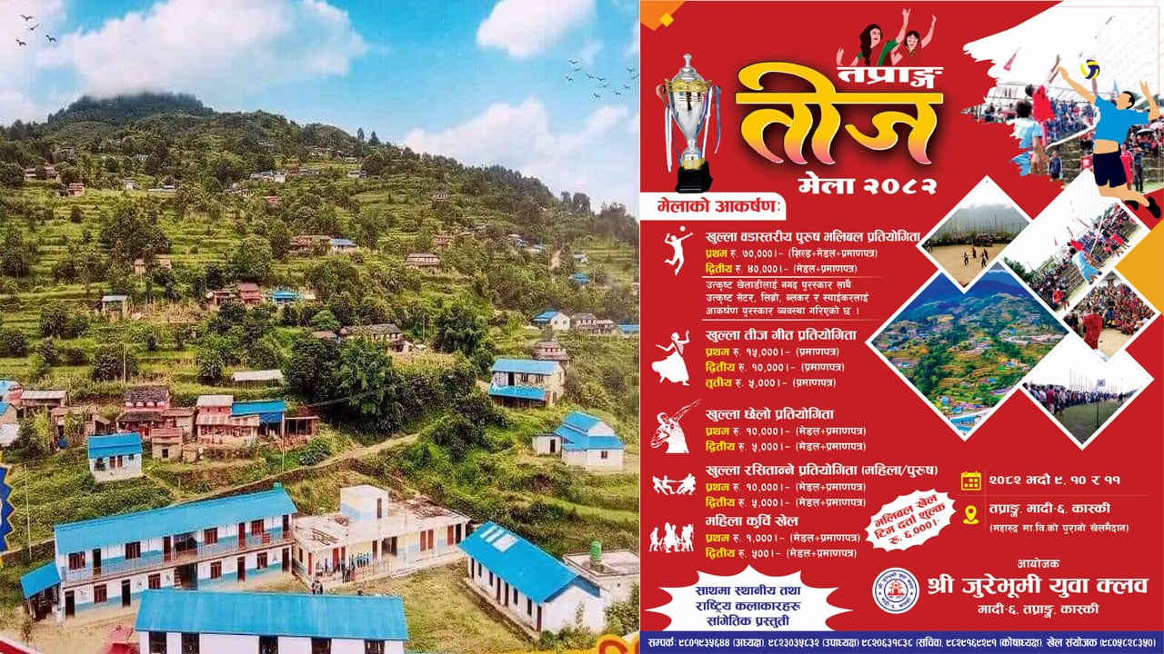 कास्कीको मादी गाउँपालिका–६ तप्राङमा तीज मेला हुने भएको छ । जुरेभूमि युवा क्लबको आयोजनामा आगामी भदौ ९ देखि ११ गतेसम्म गाउँकै महारुद्र माविको पुरानो खेल मैदानमा मेला हुने भएको हो ।