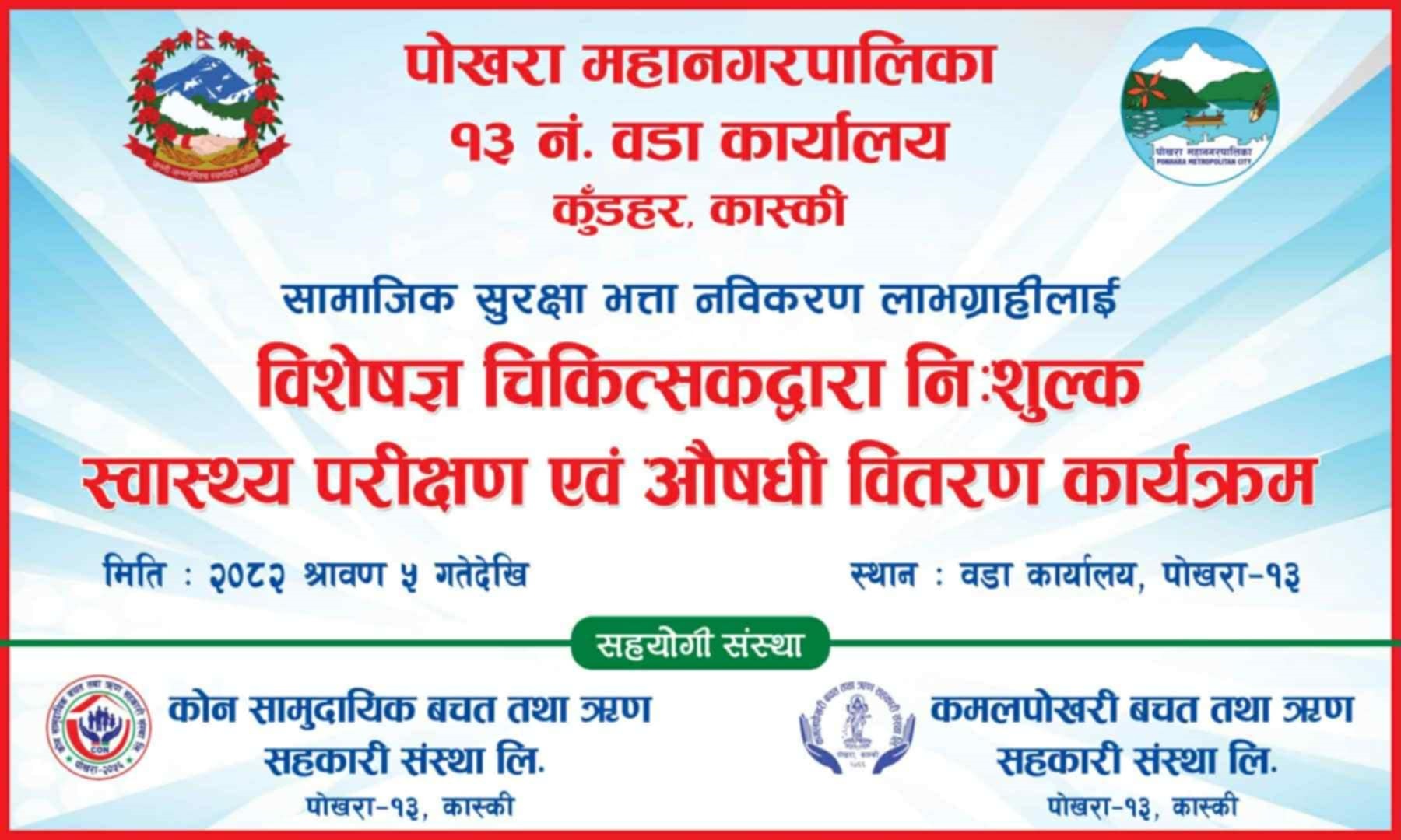 पोखरा महानगरपालिका वडा नम्बर १३ले वडा कार्यालयमा सामाजिक सुरक्षा भत्ता नविकरण गर्न आएका लाभग्राहीलाई लक्षित गरी निःशुल्क स्वास्थ्य परीक्षण तथा औषधि वितरण कार्यक्रम सञ्चालन गर्ने भएको छ ।