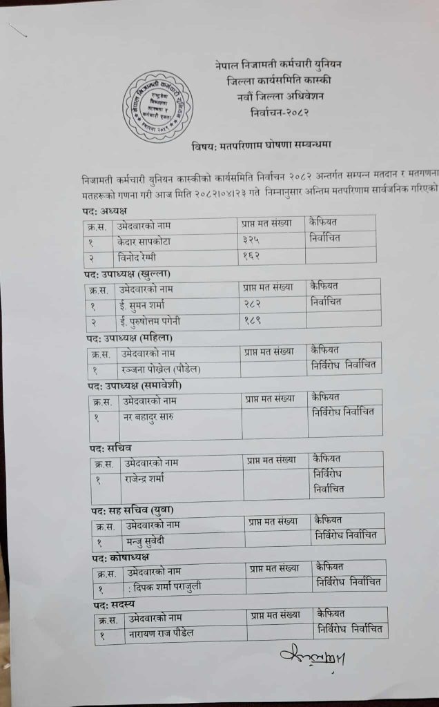 निजामती कर्मचारी युनियन कास्कीमा सापकोटा नेतृत्वको कार्यसमिति, को-को भए विजयी र पराजित? (सूचीसहित)