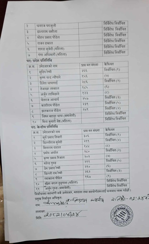 नयाँ कार्यसमितिसँगै प्रदेश र केन्द्रीय प्रतिनिधिहरू समेत चयन भएका छन् । निर्वाचन अधिकृतको कार्यालयले सार्वजनिक गरेको पूर्ण विवरण अनुसार विजयी तथा पराजित उम्मेदवारहरूको सूची यसप्रकार छ: