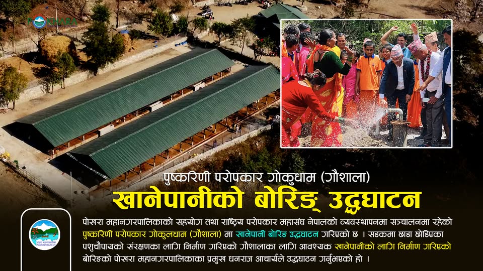 पोखरा । पोखरा महानगरपालिकाको सहयोग तथा राष्ट्रिय परोपकार महासंघ नेपालको व्यवस्थापनमा सञ्चालित पुष्करिणी परोपकार गोकुलधाम (गौशाला) मा खानेपानी बोरिङ उद्घाटन गरिएको छ । सडकमा छाडा छोडिएका पशुचौपायाको संरक्षणका लागि निर्माण गरिएको गौशालाका लागि आवश्यक खानेपानी बोरिङको पोखरा महानगरपालिकाका प्रमुख धनराज आचार्यले उद्घाटन गरे ।